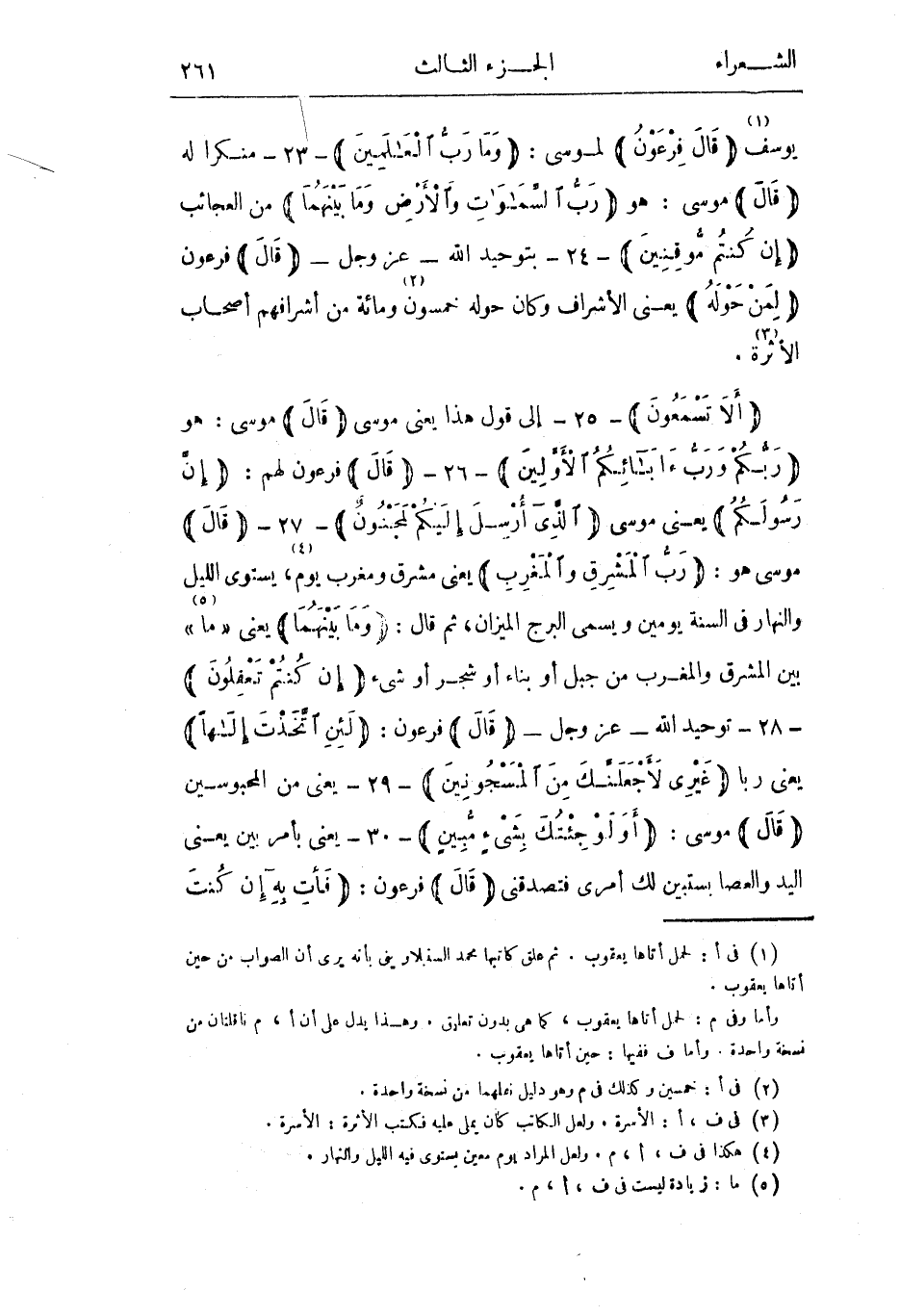 يوسف «1» قالَ فِرْعَوْنُ لموسى: وَما رَبُّ الْعالَمِينَ- 23- منكرا له قالَ موسى: هو رَبُّ السَّماواتِ وَالْأَرْضِ وَما بَيْنَهُمَا من العجائب إِنْ كُنْتُمْ مُوقِنِينَ- 24- بتوحيد الله- عز وجل- قالَ فرعون لِمَنْ حَوْلَهُ يعني الأشراف وكان حوله خمسون «2» ومائة من أشرافهم أصحاب الأثرة «3» .
