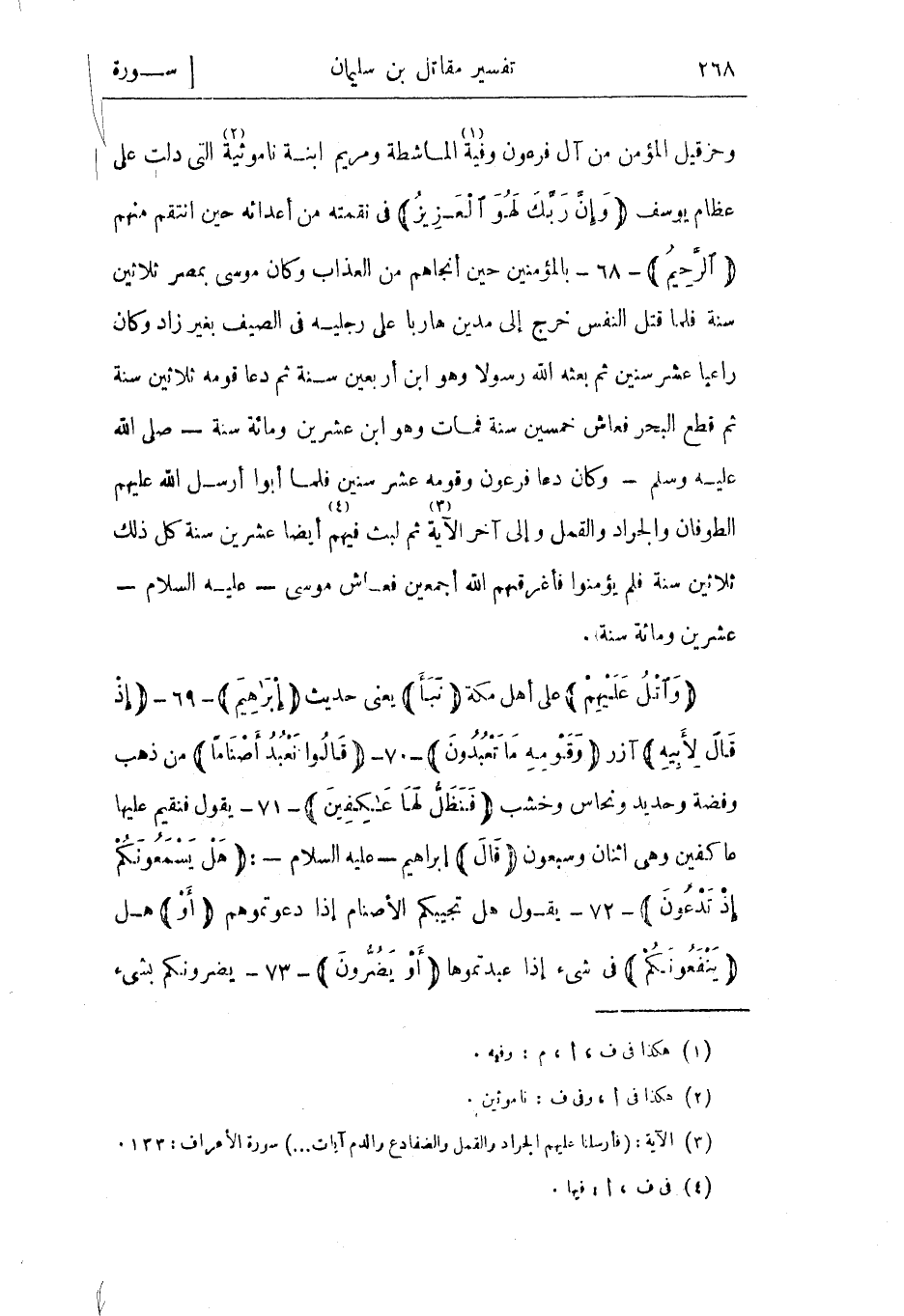 وَاتْلُ عَلَيْهِمْ على أهل مكة نَبَأَ يعني حديث إِبْراهِيمَ- 69- إِذْ قالَ لِأَبِيهِ آزر وَقَوْمِهِ ما تَعْبُدُونَ- 70- قالُوا نَعْبُدُ أَصْناماً من ذهب وفضة وحديد ونحاس وخشب فَنَظَلُّ لَها عاكِفِينَ- 71- يقول فنقيم عليها عاكفين وهي اثنان وسبعون قالَ إبراهيم- عليه السلام-: هَلْ يَسْمَعُونَكُمْ إِذْ تَدْعُونَ- 72- يقول هل تجيبكم الأصنام إذا دعوتموهم أَوْ هل يَنْفَعُونَكُمْ في شيء إذا عبدتموها أَوْ يَضُرُّونَ- 73- يضرونكم بشيء