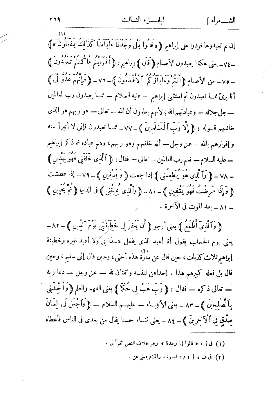 إن لم تعبدوها فردوا على إبراهيم «قالُوا بَلْ وَجَدْنا آباءَنا كَذلِكَ يَفْعَلُونَ» «1» - 74- يعني هكذا يعبدون الأصنام قالَ إبراهيم: أَفَرَأَيْتُمْ ما كُنْتُمْ تَعْبُدُونَ- 75- من الأصنام أَنْتُمْ وَآباؤُكُمُ الْأَقْدَمُونَ- 76- فَإِنَّهُمْ عَدُوٌّ لِي أنا بريء مما تعبدون ثم استثنى إبراهيم- عليه السلام- مما يعبدون ربَّ العالمين- جل جلاله- وعبادتهم الله لأنهم يعلمون أن الله- تعالى- هو ربهم هو الذي خلقهم قوله: إِلَّا رَبَّ الْعالَمِينَ- 77- مما تعبدون فإني لا أتبرأ منه وإقرارَهم بالله- عز وجل- أنه خلقهم وهو ربهم، وهم عباده ثم ذكر إبراهيم- عليه السلام- نِعَمَ ربِّ العالمينَ- تعالى- فقال: الَّذِي خَلَقَنِي فَهُوَ يَهْدِينِ- 78- وَالَّذِي هُوَ يُطْعِمُنِي إذا جعت وَيَسْقِينِ- 79- إذا عطشت وَإِذا مَرِضْتُ فَهُوَ يَشْفِينِ- 80- وَالَّذِي يُمِيتُنِي في الدنيا ثُمَّ يُحْيِينِ- 81- بعد الموت في الآخرة.
