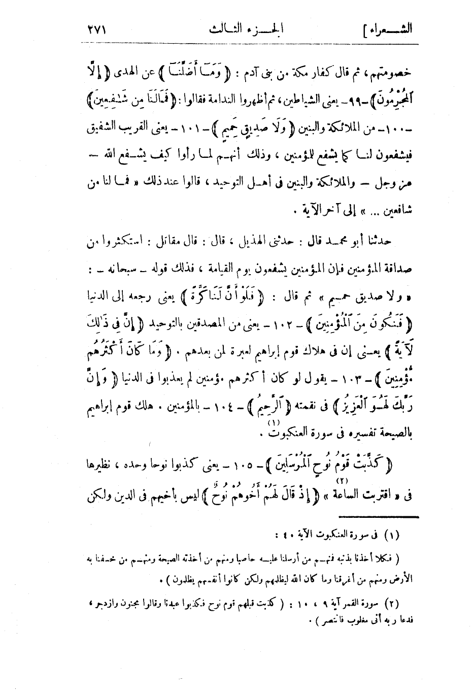 «وَلا صَدِيقٍ حَمِيمٍ» ثم قال: فَلَوْ أَنَّ لَنا كَرَّةً يعني رجعة إلى الدنيا فَنَكُونَ مِنَ الْمُؤْمِنِينَ- 102- يعني من المصدقين بالتوحيد إِنَّ فِي ذلِكَ لَآيَةً يعني إن في هلاك قوم إبراهيم لعبرة لمن بعدهم. وَما كانَ أَكْثَرُهُمْ مُؤْمِنِينَ- 103- يقول لو كان أكثرهم مؤمنين لم يعذبوا في الدنيا وَإِنَّ رَبَّكَ لَهُوَ الْعَزِيزُ في نقمته الرَّحِيمُ- 104- بالمؤمنين. هلك قوم إبراهيم بالصيحة تفسيره فى سورة العنكبوت «1» .