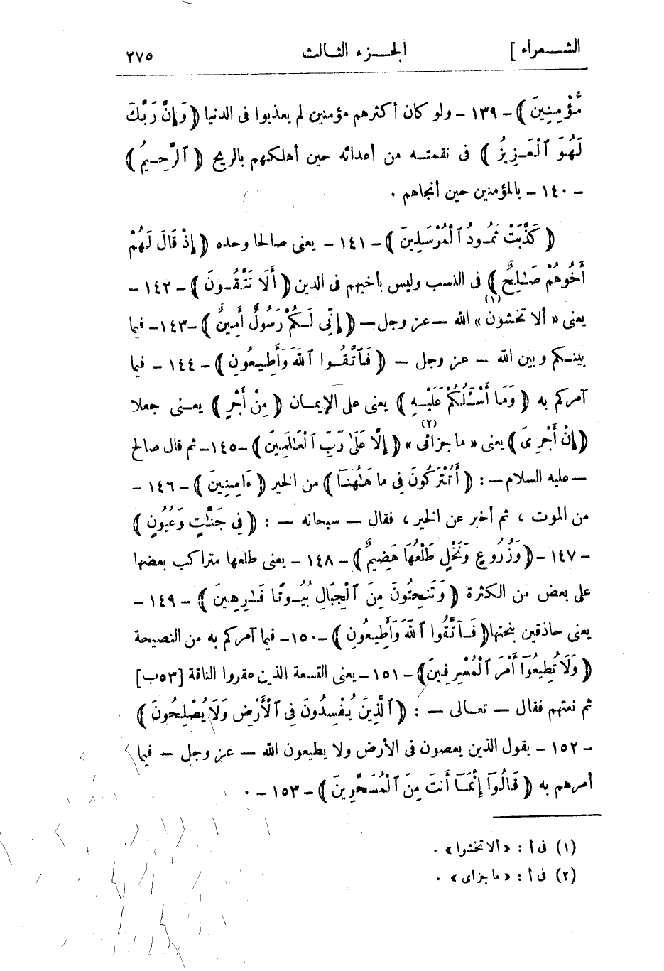 كَذَّبَتْ ثَمُودُ الْمُرْسَلِينَ- 141- يعني صالحا وحده إِذْ قالَ لَهُمْ أَخُوهُمْ صالِحٌ فى النسب وليس بأخيهم فى الدين أَلا تَتَّقُونَ- 142- يعني «ألا تخشون» «1» الله- عز وجل- إِنِّي لَكُمْ رَسُولٌ أَمِينٌ- 143- فيما بينكم وبين الله- عز وجل- فَاتَّقُوا اللَّهَ وَأَطِيعُونِ- 144- فيما آمركم به وَما أَسْئَلُكُمْ عَلَيْهِ يعني على الإيمان مِنْ أَجْرٍ يعني جعلا إِنْ أَجْرِيَ يعني «ما جزائي» «2» إِلَّا عَلى رَبِّ الْعالَمِينَ- 145- ثم قال صالح- عليه السلام-: أَتُتْرَكُونَ فِي ما هاهُنا من الخير آمِنِينَ- 146- من الموت، ثم أخبر عن الخير، فقال- سبحانه-: فِي جَنَّاتٍ وَعُيُونٍ- 147- وَزُرُوعٍ وَنَخْلٍ طَلْعُها هَضِيمٌ- 148- يعني طلعها متراكب بعضها على بعض من الكثرة وَتَنْحِتُونَ مِنَ الْجِبالِ بُيُوتاً فارِهِينَ- 149- يعني حاذقين بنحتها فَاتَّقُوا اللَّهَ وَأَطِيعُونِ- 150- فيما آمركم به من النصيحة وَلا تُطِيعُوا أَمْرَ الْمُسْرِفِينَ- 151- يعنى التسعة الذين عقروا الناقة [53 ب] ثم نعتهم فقال- تعالى-: الَّذِينَ يُفْسِدُونَ فِي الْأَرْضِ وَلا يُصْلِحُونَ- 152- يقول الذين يعصون في الأرض ولا يطيعون الله- عز وجل- فيما أمرهم به قالُوا إِنَّما أَنْتَ مِنَ الْمُسَحَّرِينَ- 153.