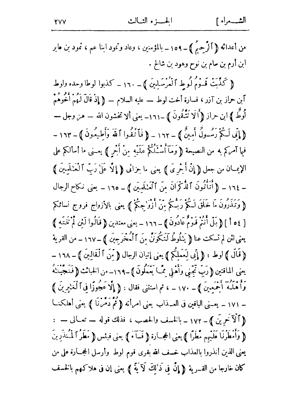 كَذَّبَتْ قَوْمُ لُوطٍ الْمُرْسَلِينَ- 160- كذبوا لوطا وحده ولوط ابن حراز بن آزر، فسارة أخت لوط- عليه السلام- إِذْ قالَ لَهُمْ أَخُوهُمْ لُوطٌ ابن حراز أَلا تَتَّقُونَ- 161- يعني ألا تخشون الله- عز وجل- إِنِّي لَكُمْ رَسُولٌ أَمِينٌ- 162- فَاتَّقُوا اللَّهَ وَأَطِيعُونِ- 163- فيما آمركم به من النصيحة وَما أَسْئَلُكُمْ عَلَيْهِ مِنْ أَجْرٍ يعني ما أسألكم على الإيمان من جعل إِنْ أَجْرِيَ يعني ما جزائي إِلَّا عَلى رَبِّ الْعالَمِينَ- 164- أَتَأْتُونَ الذُّكْرانَ مِنَ الْعالَمِينَ- 165- يعني نكاح الرجال وَتَذَرُونَ مَا خَلَقَ لَكُمْ رَبُّكُمْ مِنْ أَزْواجِكُمْ يعنى بالأزواج فروج نسائكم [54 أ] بَلْ أَنْتُمْ قَوْمٌ عادُونَ- 166- يعنى معتدين قالُوا لَئِنْ لَمْ تَنْتَهِ يعني لئن لم تسكت عنا يَا لُوطُ لَتَكُونَنَّ مِنَ الْمُخْرَجِينَ- 167- من القرية قالَ لوط: إِنِّي لِعَمَلِكُمْ يعني إتيان الرجال مِنَ الْقالِينَ- 168- يعني الماقتين رَبِّ نَجِّنِي وَأَهْلِي مِمَّا يَعْمَلُونَ- 169- من الخبائث فَنَجَّيْناهُ وَأَهْلَهُ أَجْمَعِينَ- 170-، ثم استثنى فقال: إِلَّا عَجُوزاً فِي الْغابِرِينَ- 171- يعني الباقين في العذاب يعني امرأته ثُمَّ دَمَّرْنَا يعني أهلكنا الْآخَرِينَ- 172- بالخسف والحصب، فذلك قوله- تعالى-: