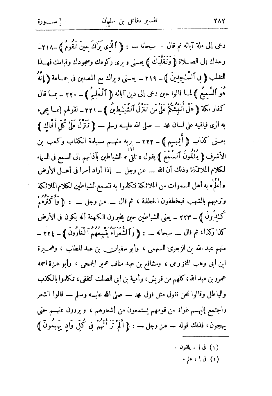 - 218- وحدك إلى الصلاة وَتَقَلُّبَكَ يعني ويرى ركوعك وسجودك وقيامك فهذا التقلب فِي السَّاجِدِينَ- 219- يعني ويراك مع المصلين في جماعة إِنَّهُ هُوَ السَّمِيعُ لما قالوا حين دُعِيَ إلى دين آبائه الْعَلِيمُ- 220- بما قال كفار مكة هَلْ أُنَبِّئُكُمْ عَلى مَنْ تَنَزَّلُ الشَّياطِينُ- 221- لقولهم إنما يجيء به الري فيلقيه على لسان محمد- صلى الله عليه وسلم- تَنَزَّلُ عَلى كُلِّ أَفَّاكٍ يعني كذاب أَثِيمٍ- 222- بربه منهم مسيلمةُ الكذاب وكعبُ بن الأشرف يُلْقُونَ السَّمْعَ يقول «تلقي» «1» الشياطين بآذانهم إلى السمع في السماء لكلام الملائكة وذلك أن الله- عز وجل- إذا أراد أمرا في أهل الأرض «أعلم» «2» به أهل السموات من الملائكة فتكلموا به فتسمع الشياطين لكلام الملائكة وترميهم بالشهب فيخطفون الخطفة، ثم قال- عز وجل-: وَأَكْثَرُهُمْ كاذِبُونَ- 223- يعني الشياطين حين يخبرون الكهنة أنه يكون في الأرض كذا وكذا، ثم قال- سبحانه-: وَالشُّعَراءُ يَتَّبِعُهُمُ الْغاوُونَ- 224- منهم عبد الله بن الزبعري السهمي، وأبو سفيان بن عبد المطلب، وهميرة ابن أبى وهب المخزومي، ومشافع بن عبد مناف عمير الجمحي، وأبو عزة اسمه عمرو بن عبد الله، كلهم من قريش، وأمية بن أبي الصلت الثقفي، تكلموا بالكذب والباطل وقالوا نحن نقول مثل قول محمد- صلى الله عليه وسلم- قالوا الشعر واجتمع إليهم غواة من قومهم يستمعون من أشعارهم، ويروون عنهم حتى يهجون، فذلك قوله- عز وجل-: أَلَمْ تَرَ أَنَّهُمْ فِي كُلِّ وادٍ يَهِيمُونَ
