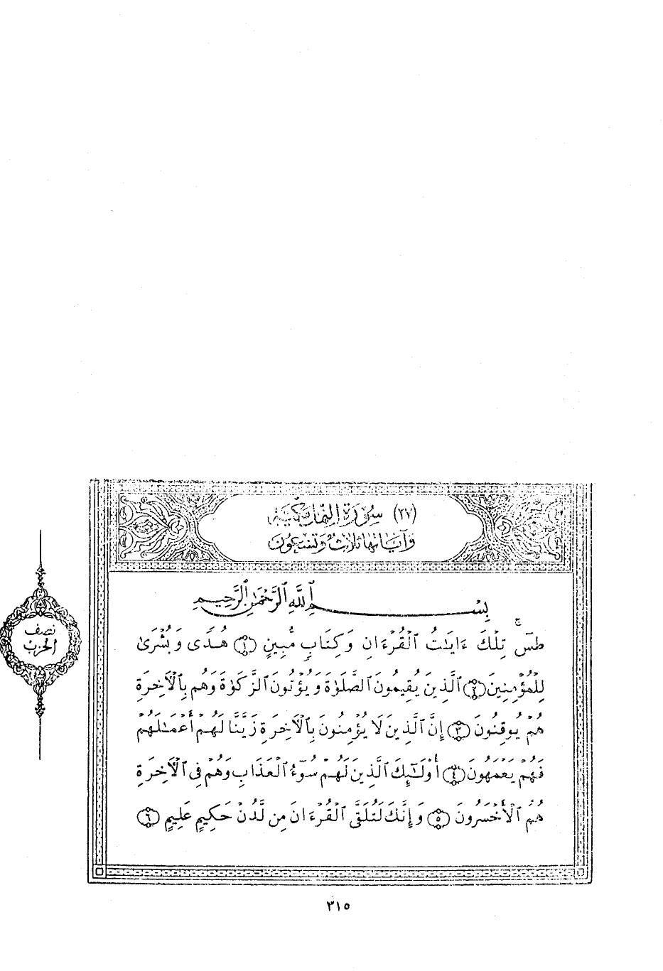 طس تِلْكَ آياتُ الْقُرْآنِ وَكِتابٍ مُبِينٍ (1) هُدىً وَبُشْرى لِلْمُؤْمِنِينَ (2) الَّذِينَ يُقِيمُونَ الصَّلاةَ وَيُؤْتُونَ الزَّكاةَ وَهُمْ بِالْآخِرَةِ هُمْ يُوقِنُونَ (3) إِنَّ الَّذِينَ لا يُؤْمِنُونَ بِالْآخِرَةِ زَيَّنَّا لَهُمْ أَعْمالَهُمْ فَهُمْ يَعْمَهُونَ (4)