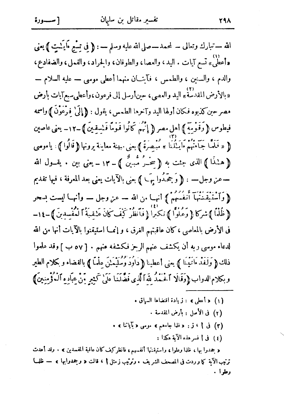الله- تبارك وتعالى- لمحمد- صلى الله عليه وسلم-: فِي تِسْعِ آياتٍ يعني «أعطي» «1» تسع آيات. اليد، والعصا، والطوفان، والجراد، والقمل، والضفادع، والدم، والسنين، والطمس، فآيتان منهما أعطي موسى- عليه السلام- «بالأرض المقدسة» «2» اليد والعصى، حين أرسل إلى فرعون، وأعطي سبع آيات بأرض مصر حين كذبوه فكان أولها اليد وآخرها الطمس، يقول: إِلى فِرْعَوْنَ واسمه فيطوس وَقَوْمِهِ أهل مصر إِنَّهُمْ كانُوا قَوْماً فاسِقِينَ- 12- يعنى عاصين «فَلَمَّا جاءَتْهُمْ آياتُنا» «3» مُبْصِرَةً يعني مبينة معاينة يرونها قالُوا: يا موسى هَذَا الذي جئت به سِحْرٌ مُبِينٌ- 13- يعني بين. يقول الله- عز وجل-: وَجَحَدُوا بِها يعني بالآيات يعني بعد المعرفة، فيها تقديم وَاسْتَيْقَنَتْها أَنْفُسُهُمْ أنها من الله- عز وجل- وأنها ليست بسحر ظُلْماً شركا وَعُلُوًّا تكبرا «4» فَانْظُرْ كَيْفَ كانَ عاقِبَةُ الْمُفْسِدِينَ- 14- في الأرض بالمعاصي، كان عاقبتهم الغرق، وإنما استيقنوا بالآيات أنها من الله لدعاء موسى ربه أن يكشف عنهم الرجز فكشفه عنهم. [57 ب] وقد علموا ذلك وَلَقَدْ آتَيْنا يعني أعطينا داوُدَ وَسُلَيْمانَ عِلْماً بالقضاء وبكلام الطير وبكلام الدواب وَقالا الْحَمْدُ لِلَّهِ الَّذِي فَضَّلَنا عَلى كَثِيرٍ مِنْ عِبادِهِ الْمُؤْمِنِينَ