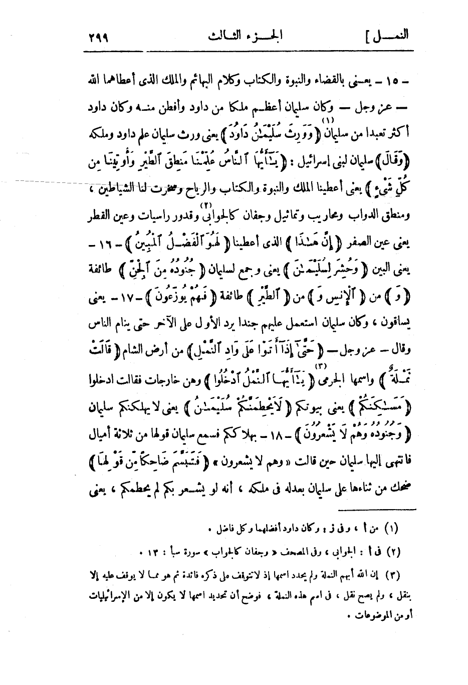 - 15- يعني بالقضاء والنبوة والكتاب وكلام البهائم والملك الذي أعطاهما الله- عز وجل- وكان سليمان أعظم ملكا من داود وأفطن منه وكان داود أكثر تعبدا من سليمان «1» وَوَرِثَ سُلَيْمانُ داوُدَ يعني ورث سليمان علم داود وملكه وَقالَ سليمان لبنى إسرائيل: يا أَيُّهَا النَّاسُ عُلِّمْنا مَنْطِقَ الطَّيْرِ وَأُوتِينا مِنْ كُلِّ شَيْءٍ يعنى أعطنا الملك والنبوة والكتاب والرياح وسخرت لنا الشياطين، ومنطق الدواب ومحاريب وتماثيل وجفان كالجوابي «2» وقدور راسيات وعين الفطر يعني عين الصفر إِنَّ هَذَا الذي أعطينا لَهُوَ الْفَضْلُ الْمُبِينُ- 16- يعني البين وَحُشِرَ لِسُلَيْمانَ يعني وجمع لسليمان جُنُودُهُ مِنَ الْجِنِّ طائفة وَمن الْإِنْسِ وَمن الطَّيْرِ طائفة فَهُمْ يُوزَعُونَ- 17- يعني يساقون، وكان سليمان استعمل عليهم جندا يرد الأول على الآخر حتى ينام الناس وقال- عز وجل- حَتَّى إِذا أَتَوْا عَلى وادِ النَّمْلِ من أرض الشام قالَتْ نَمْلَةٌ واسمها الجرمي «3» يا أَيُّهَا النَّمْلُ ادْخُلُوا وهن خارجات فقالت ادخلوا مَساكِنَكُمْ يعني بيوتكم لا يَحْطِمَنَّكُمْ سُلَيْمانُ يعني لا يهلكنكم سليمان وَجُنُودُهُ وَهُمْ لا يَشْعُرُونَ- 18- بهلاككم فسمع سليمان قولها من ثلاثة أميال فانتهى إليها سليمان حين قالت «وَهُمْ لا يشعرون» فَتَبَسَّمَ ضاحِكاً مِنْ قَوْلِها ضحك من ثناءها على سليمان بعدله في ملكه، أنه لو يشعر بكم لم يحطمكم، يعنى