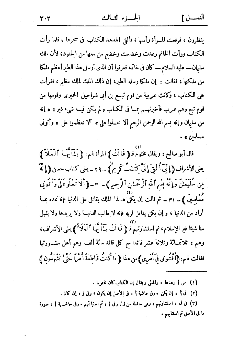 ينظرون، فرفعت المرأة رأسها، فألقى الهدهد الكتاب في حجرها، فلما رأت الكتاب ورأت الخاتم رعدت وخضعت وخضع من معها من الجنود، لأن ملك سليمان- عليه السلام- كان في خاتمه فعرفوا أن الذي أرسل هذا الطير أعظم ملكا من ملكها، فقالت: إن ملكا رسله الطير، إن ذلك الملك لملك عظيم، فقرأت هي الكتاب، وكانت عربية من قوم تبع بن أبي شراحيل الحميري وقومها من قوم تبع وهم عرب فأخبرتهم بما في الكتاب ولم يكن فيه شيء غير: «إِنَّهُ مِنْ سُلَيْمانَ وَإِنَّهُ بِسْمِ اللَّهِ الرَّحْمنِ الرَّحِيمِ أَلَّا تَعْلُوا عَلَيَّ» ألا تعظموا علي «وَأْتُونِي مُسْلِمِينَ» .