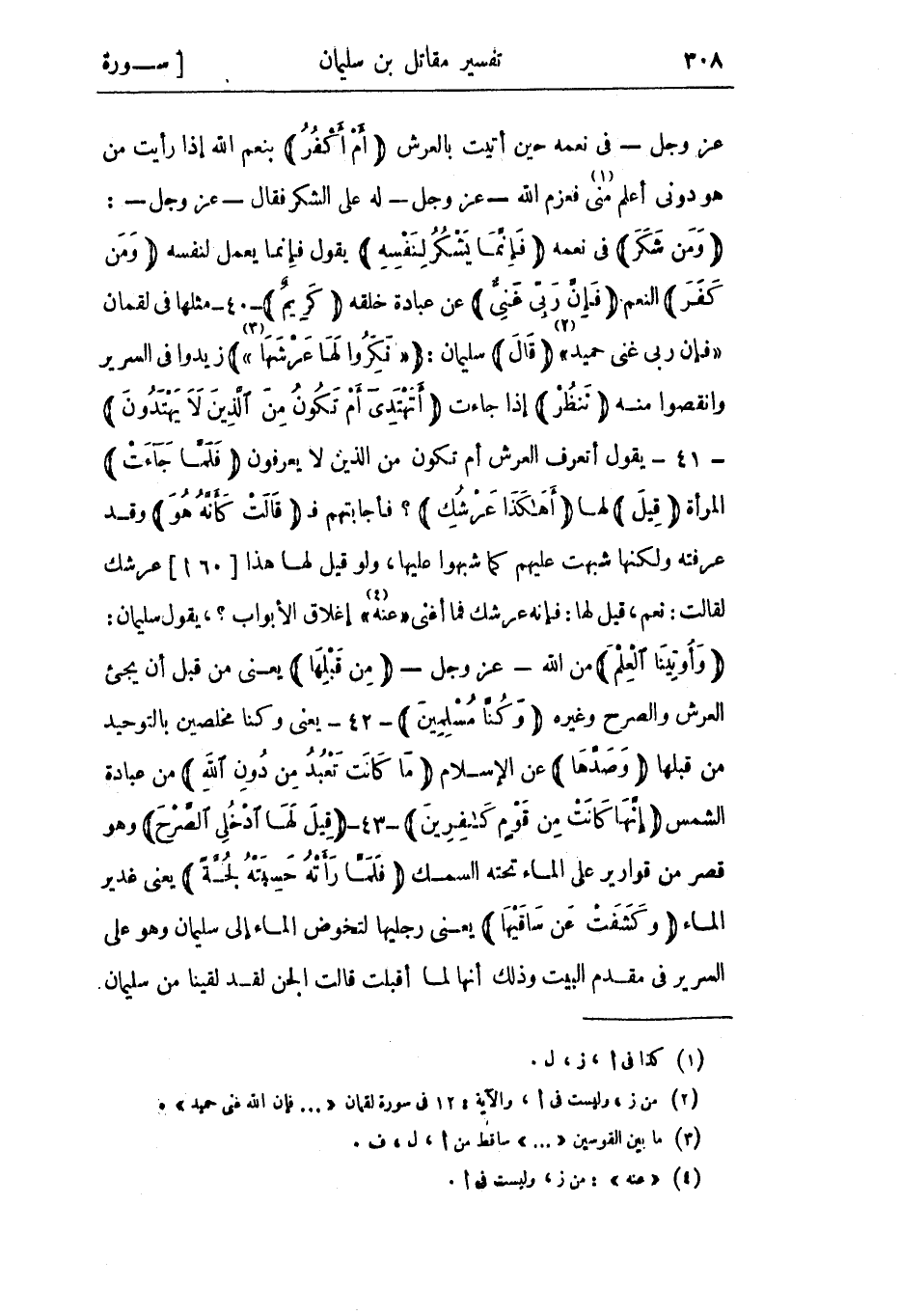 وَمَنْ شَكَرَ في نعمه فَإِنَّما يَشْكُرُ لِنَفْسِهِ يقول فإنما يعمل لنفسه وَمَنْ كَفَرَ النعم فَإِنَّ رَبِّي غَنِيٌّ عن عبادة خلقه كَرِيمٌ- 40- مثلها في لقمان «فَإِنَّ اللَّهَ غَنِيٌّ حَمِيدٌ» «2» قالَ سليمان: «نَكِّرُوا لَها عَرْشَها» «3» زيدوا في السرير وانقصوا منه نَنْظُرْ إذا جاءت أَتَهْتَدِي أَمْ تَكُونُ مِنَ الَّذِينَ لا يَهْتَدُونَ- 41- يقول أتعرف العرش أم تكون من الذين لا يعرفون فَلَمَّا جاءَتْ المرأة قِيلَ لها أَهكَذا عَرْشُكِ؟ فأجابتهم ف قالَتْ كَأَنَّهُ هُوَ وقد عرفته ولكنها شبهت عليهم كما شبهوا عليها، ولو قيل لها هذا [60 أ] عرشك لقالت: نعم، قيل لها: فإنه عرشك فما أغنى «عنه» «4» إغلاق الأبواب؟، يقول سليمان: