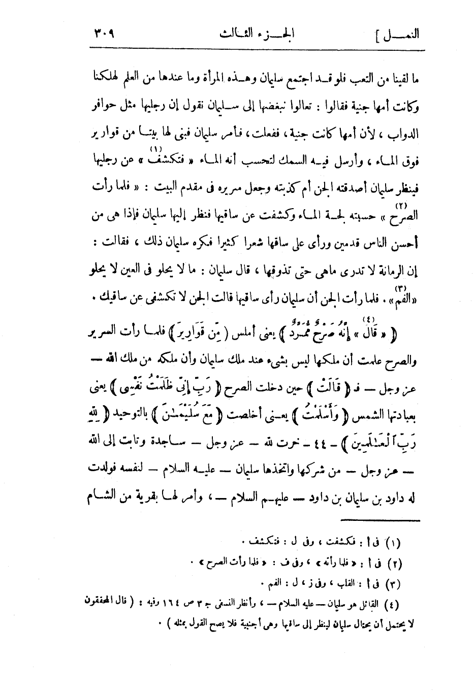 (4) القائل هو سليمان- عليه السلام-، وأنظر النسفي ج 3 ص 164 وفيه: (قال المحققون لا يحتمل أن يحتال سليمان لينظر إلى ساقيها وهي أجنبية فلا يصح القول بمثله) .