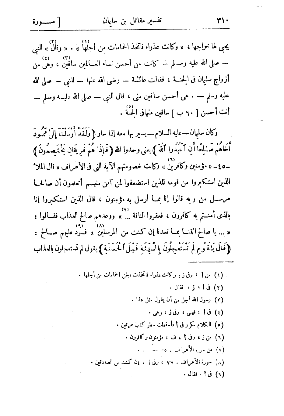 وكان سليمان- عليه السلام- يسير بها معه إذا سار وَلَقَدْ أَرْسَلْنا إِلى ثَمُودَ أَخاهُمْ صالِحاً أَنِ اعْبُدُوا اللَّهَ يعني وحدوا الله فَإِذا هُمْ فَرِيقانِ يَخْتَصِمُونَ- 45- «مؤمنين وكافرين» «6» وكانت خصومتهم الآية التي في الأعراف «قالَ الْمَلَأُ الَّذِينَ اسْتَكْبَرُوا مِنْ قَوْمِهِ لِلَّذِينَ اسْتُضْعِفُوا لِمَنْ آمَنَ مِنْهُمْ أَتَعْلَمُونَ أَنَّ صالِحاً مُرْسَلٌ مِنْ رَبِّهِ قالُوا إِنَّا بِما أُرْسِلَ بِهِ مُؤْمِنُونَ، قالَ الَّذِينَ اسْتَكْبَرُوا إِنَّا بِالَّذِي آمَنْتُمْ بِهِ كافِرُونَ، فَعَقَرُوا النَّاقَةَ ... »