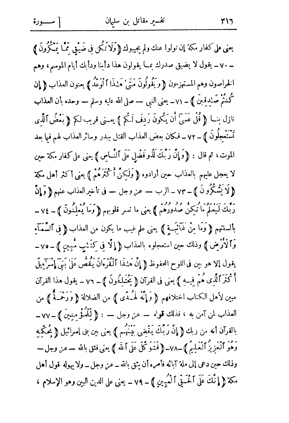 يعني على كفار مكة إن تولوا عنك ولم يجيبوك وَلا تَكُنْ فِي ضَيْقٍ مِمَّا يَمْكُرُونَ- 70- يقول لا يضيق صدرك بما يقولون هذا دأبنا ودأبك أيام الموسم، وهم الخراصون وهم المستهزءون وَيَقُولُونَ مَتى هذَا الْوَعْدُ يعنون العذاب إِنْ كُنْتُمْ صادِقِينَ- 71- يعني النبي- صلى الله عليه وسلم- وحده بأن العذاب نازل بنا قُلْ عَسى أَنْ يَكُونَ رَدِفَ لَكُمْ يعنى قريب لكم بَعْضُ الَّذِي تَسْتَعْجِلُونَ- 72- فكان بعض العذاب القتل ببدر وسائر العذاب لهم فيما بعد الموت، ثم قال: وَإِنَّ رَبَّكَ لَذُو فَضْلٍ عَلَى النَّاسِ يعني على كفار مكة حين لا يعجل عليهم بالعذاب حين أرادوه وَلَكِنَّ أَكْثَرَهُمْ يعني أكثر أهل مكة لا يَشْكُرُونَ- 73- الرب- عز وجل- في تأخير العذاب عنهم وَإِنَّ رَبَّكَ لَيَعْلَمُ مَا تُكِنُّ صُدُورُهُمْ يعني ما تسر قلوبهم وَما يُعْلِنُونَ- 74- بألسنتهم وَما مِنْ غائِبَةٍ يعني علم غيب ما يكون من العذاب فِي السَّماءِ وَالْأَرْضِ وذلك حين استعجلوه بالعذاب إِلَّا فِي كِتابٍ مُبِينٍ- 75- يقول إلا هو بين في اللوح المحفوظ إِنَّ هذَا الْقُرْآنَ يَقُصُّ عَلى بَنِي إِسْرائِيلَ أَكْثَرَ الَّذِي هُمْ فِيهِ يعني في القرآن يَخْتَلِفُونَ- 76- يقول هذا القرآن مبين لأهل الكتاب اختلافهم وَإِنَّهُ لَهُدىً من الضلالة وَرَحْمَةٌ من العذاب لمن آمن به، فذلك قوله- عز وجل-: لِلْمُؤْمِنِينَ- 77- بالقرآن أنه من ربك إِنَّ رَبَّكَ يَقْضِي بَيْنَهُمْ يعني بين بني إسرائيل بِحُكْمِهِ وَهُوَ الْعَزِيزُ الْعَلِيمُ- 78- فَتَوَكَّلْ عَلَى اللَّهِ يعني فثق بالله- عز وجل- وذلك حين دعيَ إلى ملة آبائه فأمره أن يثق بالله- عز وجل- ولا يهوله قول أهل مكة إِنَّكَ عَلَى الْحَقِّ الْمُبِينِ- 79- يعني على الدين البين وهو الإسلام،