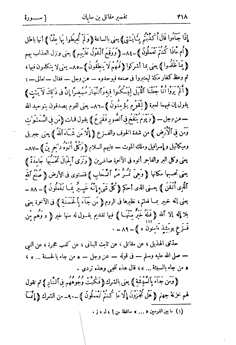 أَلَمْ يَرَوْا أَنَّا جَعَلْنَا اللَّيْلَ لِيَسْكُنُوا فِيهِ وَالنَّهارَ مُبْصِراً إِنَّ فِي ذلِكَ لَآياتٍ يقول إن فيهما لعبرة لِقَوْمٍ يُؤْمِنُونَ- 86- يعني لقوم يصدقون بتوحيد الله- عز وجل- وَيَوْمَ يُنْفَخُ فِي الصُّورِ فَفَزِعَ يقول فمات مَنْ فِي السَّماواتِ وَمَنْ فِي الْأَرْضِ من شدة الخوف والفزع إِلَّا مَنْ شاءَ اللَّهُ يعني جبريل وميكائيل وإسرافيل وملك الموت- عليهم السلام وَكُلٌّ أَتَوْهُ داخِرِينَ- 87- يعني وكل البر والفاجر أتوه في الآخرة صاغرين وَتَرَى الْجِبالَ تَحْسَبُها جامِدَةً يعني تحسبها مكانها وَهِيَ تَمُرُّ مَرَّ السَّحابِ فتستوي في الأرض صُنْعَ اللَّهِ الَّذِي أَتْقَنَ يعني الذي أحكم كُلَّ شَيْءٍ إِنَّهُ خَبِيرٌ بِما تَفْعَلُونَ- 88- يعني إنه خبير بما فعلتم، نظيرها في الروم مَنْ جاءَ بِالْحَسَنَةِ في الآخرة يعني بلا إله إلا الله فَلَهُ خَيْرٌ مِنْها فيها تقديم يقول له منها خير «وَهُمْ مِنْ فَزَعٍ يَوْمَئِذٍ آمِنُونَ» «1» - 89-.