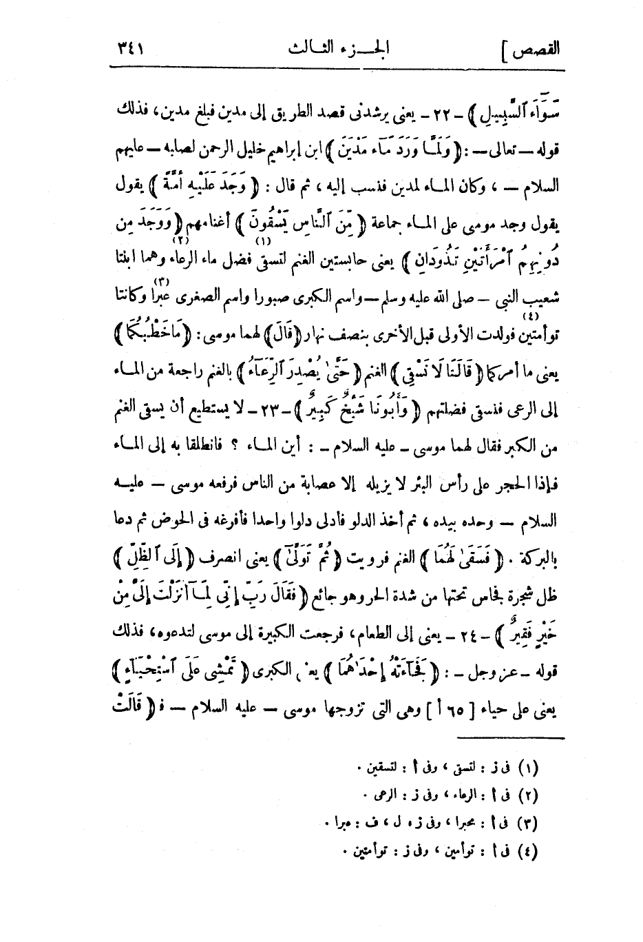 يعني يرشدني قصد الطريق إلى مدين فبلغ مدين، فذلك قوله- تعالى-: وَلَمَّا وَرَدَ ماءَ مَدْيَنَ ابن إبراهيم خليل الرحمن لصلبه- عليهم السلام-، وكان الماء لمدين فنسب إليه، ثم قال: وَجَدَ عَلَيْهِ أُمَّةً يقول يقول وجد موسى على الماء جماعة مِنَ النَّاسِ يَسْقُونَ أغنامهم وَوَجَدَ مِنْ دُونِهِمُ امْرَأَتَيْنِ تَذُودانِ يعني حابستين الغنم لتسقى «1» فضل ماء الرعاء «2» وهما ابنتا شعيب النبي- صلى الله عليه وسلم- واسم الكبرى صبورا واسم الصغرى عبرا»