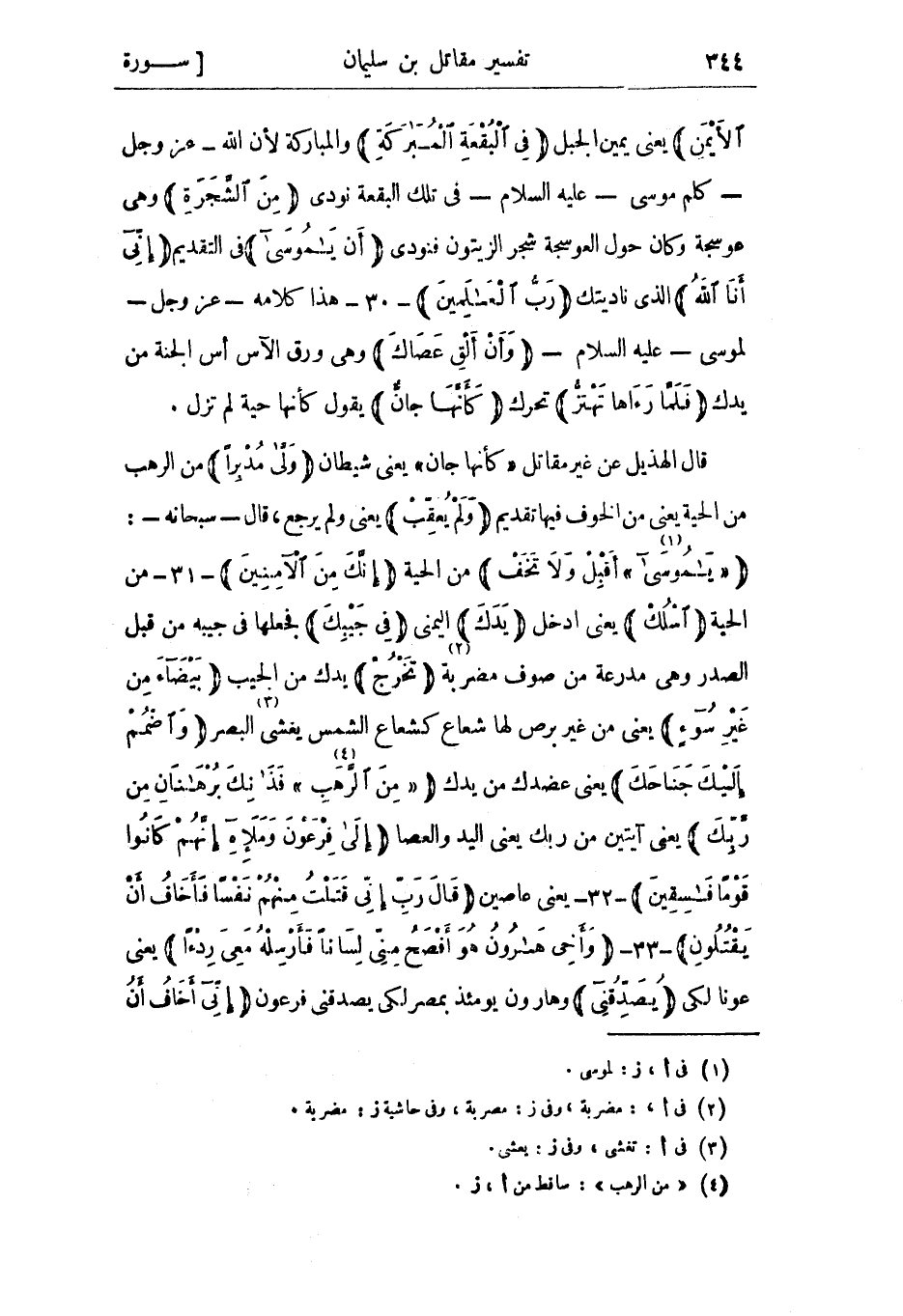 «يَا مُوسى» «1» أَقْبِلْ وَلا تَخَفْ من الحية إِنَّكَ مِنَ الْآمِنِينَ- 31- من الحية اسْلُكْ يعني أدخل يَدَكَ اليمنى فِي جَيْبِكَ فجعلها في جيبه من قبل الصدر وهي مدرعة من صوف مضربة «2» تَخْرُجْ يدك من الجيب بَيْضاءَ مِنْ غَيْرِ سُوءٍ يعني من غير برص لها شعاع كشعاع الشمس يغشى «3» البصر وَاضْمُمْ إِلَيْكَ جَناحَكَ يعني عضدك من يدك «مِنَ الرَّهْبِ» «4» فَذانِكَ بُرْهانانِ مِنْ رَبِّكَ يعنى آيتين من ربك يعني اليد والعصا إِلى فِرْعَوْنَ وَمَلَائِهِ إِنَّهُمْ كانُوا قَوْماً فاسِقِينَ- 32- يعني عاصين قالَ رَبِّ إِنِّي قَتَلْتُ مِنْهُمْ نَفْساً فَأَخافُ أَنْ يَقْتُلُونِ- 33- وَأَخِي هارُونُ هُوَ أَفْصَحُ مِنِّي لِساناً فَأَرْسِلْهُ مَعِي رِدْءاً يعني عونا لكي يُصَدِّقُنِي وهارون يومئذ بمصر لكي يصدقني فرعون