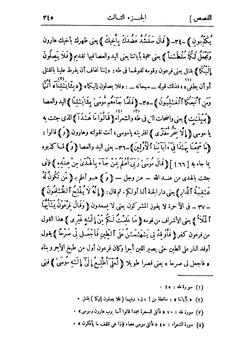 إِنِّي أَخافُ أَنْ يُكَذِّبُونِ- 34- قالَ سَنَشُدُّ عَضُدَكَ بِأَخِيكَ يعني ظهرك بأخيك هارون وَنَجْعَلُ لَكُما سُلْطاناً يعني حجة بآياتنا يعني اليد والعصا فيها تقديم فَلا يَصِلُونَ إِلَيْكُما بقتل يعني فرعون وقومه لقولهما في طه: «إِنَّنا نَخافُ أَنْ يَفْرُطَ عَلَيْنا» بالقتل «أَوْ أَنْ يَطْغى» «1» ، فذلك قوله- سبحانه-: «فَلا يَصِلُونَ إِلَيْكُمَا» بِآياتِنا «2» أَنْتُمَا وَمَنِ اتَّبَعَكُمَا الْغالِبُونَ- 35- فَلَمَّا جاءَهُمْ مُوسى بِآياتِنا اليد والعصا بَيِّناتٍ يعني واضحات التي في طه «3» والشعراء «4» قالُوا ما هذا الذي جئت به يا موسى إِلَّا سِحْرٌ مُفْتَرىً افتريته يا موسى، أنت تقولته وهارون وَقالوا: