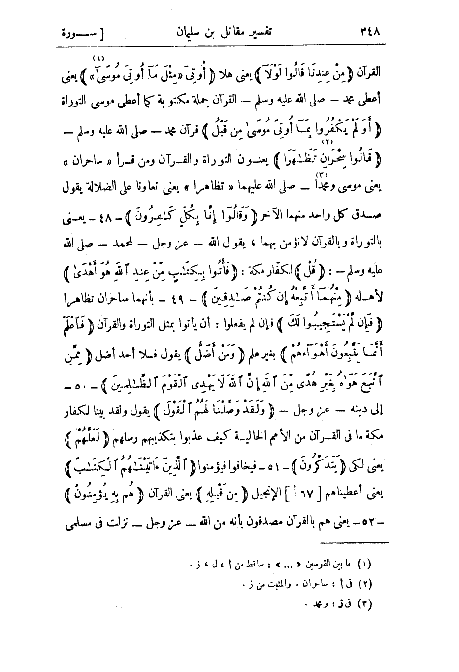 - صلى الله عليهما «تظاهرا» يعني تعاونا على الضلالة يقول صدق كل واحد منهما الآخر وَقالُوا إِنَّا بِكُلٍّ كافِرُونَ- 48- يعنى بالتوراة وبالقرآن لا نؤمن بهما، يقول اللَّه- عَزَّ وَجَلّ- لمحمد- صَلَّى اللَّهُ عَلَيْهِ وسلم-: قُلْ لكفار مكة: فَأْتُوا بِكِتابٍ مِنْ عِنْدِ اللَّهِ هُوَ أَهْدى لأهله مِنْهُما أَتَّبِعْهُ إِنْ كُنْتُمْ صادِقِينَ- 49- بأنهما ساحران تظاهرا فَإِنْ لَمْ يَسْتَجِيبُوا لَكَ فإن لم يفعلوا: أن يأتوا بمثل التوراة والقرآن فَاعْلَمْ أَنَّما يَتَّبِعُونَ أَهْواءَهُمْ بغير علم وَمَنْ أَضَلُّ يقول فلا أحد أضل مِمَّنِ اتَّبَعَ هَواهُ بِغَيْرِ هُدىً مِنَ اللَّهِ إِنَّ اللَّهَ لا يَهْدِي الْقَوْمَ الظَّالِمِينَ- 50- إلى دينه- عز وجل- وَلَقَدْ وَصَّلْنا لَهُمُ الْقَوْلَ يقول ولقد بينا لكفار مكة ما في القرآن من الأمم الخالية كيف عذبوا بتكذيبهم رسلهم لَعَلَّهُمْ يعني لكي يَتَذَكَّرُونَ- 51- فيخافوا فيؤمنوا الَّذِينَ آتَيْناهُمُ الْكِتابَ يعنى أعطيناهم [67 أ] الإنجيل مِنْ قَبْلِهِ يعني القرآن هُمْ بِهِ يُؤْمِنُونَ- 52- يعني هم بالقرآن مصدقون بأنه من الله- عز وجل- نزلت فى مسلمي
