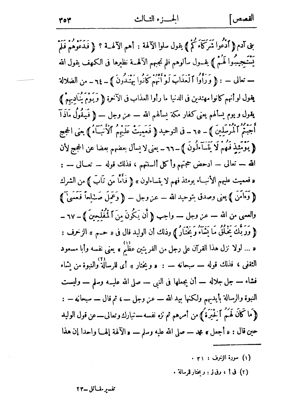 بني آدم ادْعُوا شُرَكاءَكُمْ يقول سلوا الآلهة: أهم الآلهة؟ فَدَعَوْهُمْ فَلَمْ يَسْتَجِيبُوا لَهُمْ يقول سألوهم فلم تجبهم الآلهة نظيرها في الكهف يقول الله- تعالى-: وَرَأَوُا الْعَذابَ لَوْ أَنَّهُمْ كانُوا يَهْتَدُونَ- 64- من الضلالة يقول لو أنهم كانوا مهتدين في الدنيا ما رأوا العذاب في الآخرة وَيَوْمَ يُنادِيهِمْ يقول ويوم يسألهم يعني كفار مكة يسألهم الله- عز وجل- فَيَقُولُ مَاذَا أَجَبْتُمُ الْمُرْسَلِينَ- 65- فى التوحيد فَعَمِيَتْ عَلَيْهِمُ الْأَنْباءُ يعنى الحجج يَوْمَئِذٍ فَهُمْ لا يَتَساءَلُونَ- 66- يعني لا يسأل بعضهم بعضا عن الحجج لأن الله- تعالى- أدحض حجتهم وأكل ألسنتهم، فذلك قوله- تعالى-: