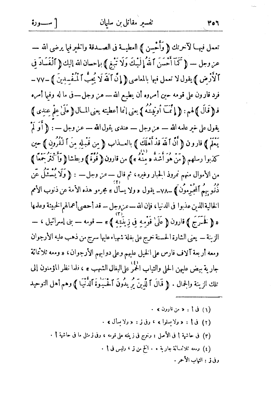 تعمل فيها لآخرتك وَأَحْسِنْ العطية في الصدقة والخير فيما يرضي الله- عز وجل- كَما أَحْسَنَ اللَّهُ إِلَيْكَ وَلا تَبْغِ بإحسان الله إليك الْفَسادَ فِي الْأَرْضِ يقول لا تعمل فيها بالمعاصي إِنَّ اللَّهَ لا يُحِبُّ الْمُفْسِدِينَ- 77- فرد قارون على قومه حين أمروه أن يطيع الله- عز وجل- فى ماله وفيما أمره ف قالَ لهم: إِنَّما أُوتِيتُهُ يعني إنما أعطيته يعنى المال عَلى عِلْمٍ عِنْدِي يقول على خير علمه الله- عز وجل- عندي يقول الله- عز وجل-: أَوَلَمْ يَعْلَمْ قارون أَنَّ اللَّهَ قَدْ أَهْلَكَ بالعذاب مِنْ قَبْلِهِ مِنَ الْقُرُونِ حين كذبوا رسلهم مَنْ هُوَ أَشَدُّ «مِنْهُ» «1» من قارون قُوَّةً وبطشا وَأَكْثَرُ جَمْعاً من الأموال منهم نمرود الجبار وغيره، ثم قال- عز وجل-: وَلا يُسْئَلُ عَنْ ذُنُوبِهِمُ الْمُجْرِمُونَ- 78- يقول «ولا يسأل» «2» مجرمو هذه الأمة عن ذنوب الأمم الخالية الذين عذبوا في الدنيا، فإن الله- عز وجل- قد أحصى أعمالهم الخبيثة وعلمها «فَخَرَجَ قارون عَلى قَوْمِهِ فِي زِينَتِهِ «3» - قومه- بني إسرائيل، - الزينة- يعني الشارة الحسنة خرج على بغلة شهباء عليها سرج من ذهب عليه الأرجوان ومعه أربعة آلاف فارس على الخيل عليهم وعلى دوابهم الأرجوان، «ومعه ثلاثمائة جارية بيض عليهن الحلي والثياب الحمر «4» على البغال الشهب» ، فلما نظر المؤمنون إلى تلك الزينة والجمال. قالَ الَّذِينَ يُرِيدُونَ الْحَياةَ الدُّنْيا وهم أهل التوحيد