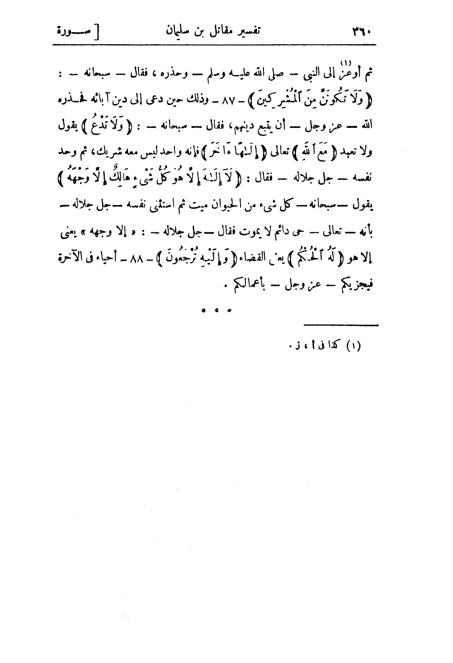 وَلا تَكُونَنَّ مِنَ الْمُشْرِكِينَ- 87- وذلك حين دعي إلى دين آبائه فحذره الله- عز وجل- أن يتبع دينهم، فقال- سبحانه-: وَلا تَدْعُ يقول ولا تعبد مَعَ اللَّهِ تعالى إِلهاً آخَرَ فإنه واحد ليس معه شريك، ثم وحد نفسه- جل جلاله- فقال: لا إِلهَ إِلَّا هُوَ كُلُّ شَيْءٍ هالِكٌ إِلَّا وَجْهَهُ يقول- سبحانه- كل شيء من الحيوان ميت ثم استثنى نفسه- جل جلاله- بأنه- تعالى- حي دائم لا يموت فقال- جل جلاله-: «إِلا وَجْهَهُ» يعني إلا هو لَهُ الْحُكْمُ يعني القضاء وَإِلَيْهِ تُرْجَعُونَ- 88- أحياء في الآخرة فيجزيكم- عز وجل- بأعمالكم.