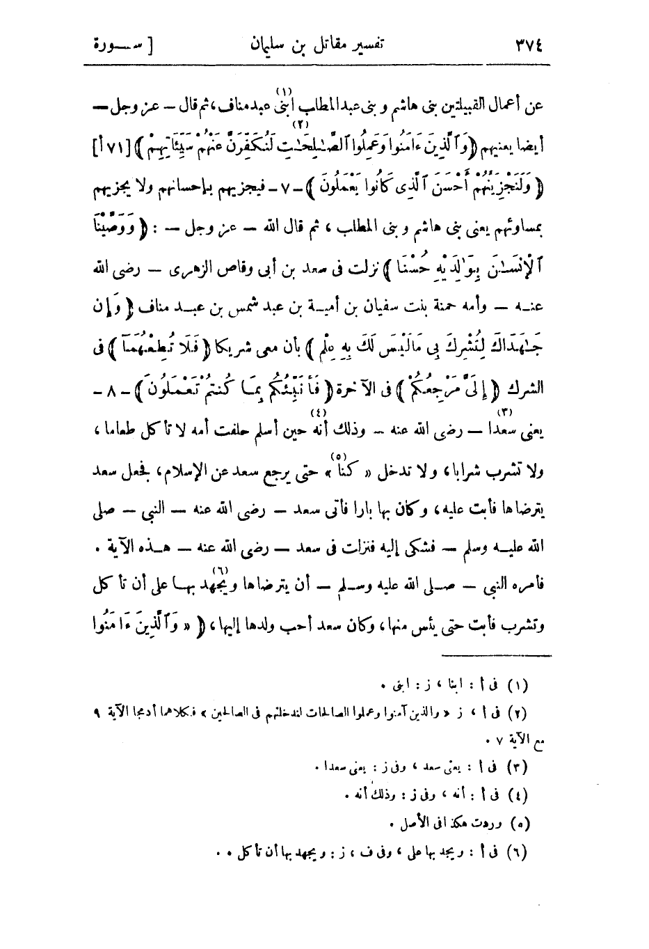 عن أعمال القبيلتين بني هاشم وبني عبد المطلب ابني «1» عبد مناف، ثم قال- عز وجل- أيضا يعنيهم وَالَّذِينَ آمَنُوا وَعَمِلُوا الصَّالِحاتِ «2» لَنُكَفِّرَنَّ عَنْهُمْ سَيِّئاتِهِمْ [71 أ] وَلَنَجْزِيَنَّهُمْ أَحْسَنَ الَّذِي كانُوا يَعْمَلُونَ- 7- فيجزيهم بإحسانهم ولا يجزيهم بمساوئهم يعني بني هاشم وبني المطلب، ثم قال الله- عز وجل-: وَوَصَّيْنَا الْإِنْسانَ بِوالِدَيْهِ حُسْناً نزلت في سعد بن أبي وقاص الزهري- رضي الله عنه- وأمه حمنة بنت سفيان بن أمية بن عبد شمس بن عبد مناف وَإِنْ جاهَداكَ لِتُشْرِكَ بِي مَا لَيْسَ لَكَ بِهِ عِلْمٌ بأن معي شريكا فَلا تُطِعْهُما في الشرك إِلَيَّ مَرْجِعُكُمْ في الآخرة فَأُنَبِّئُكُمْ بِما كُنْتُمْ تَعْمَلُونَ- 8- يعني سعدا «3» - رضي الله عنه- وذلك أنه «4» حين أسلم حلفت أمه لا تأكل طعاما، ولا تشرب شرابا، ولا تدخل «كنا» «5» حتى يرجع سعد عن الإسلام، فجعل سعد يترضاها فأبت عليه، وكان بها بارا فأتى سعد- رضي الله عنه- النبي- صلى الله عليه وسلم- فشكى إليه فنزلت في سعد- رضي الله عنه- هذه الآية.