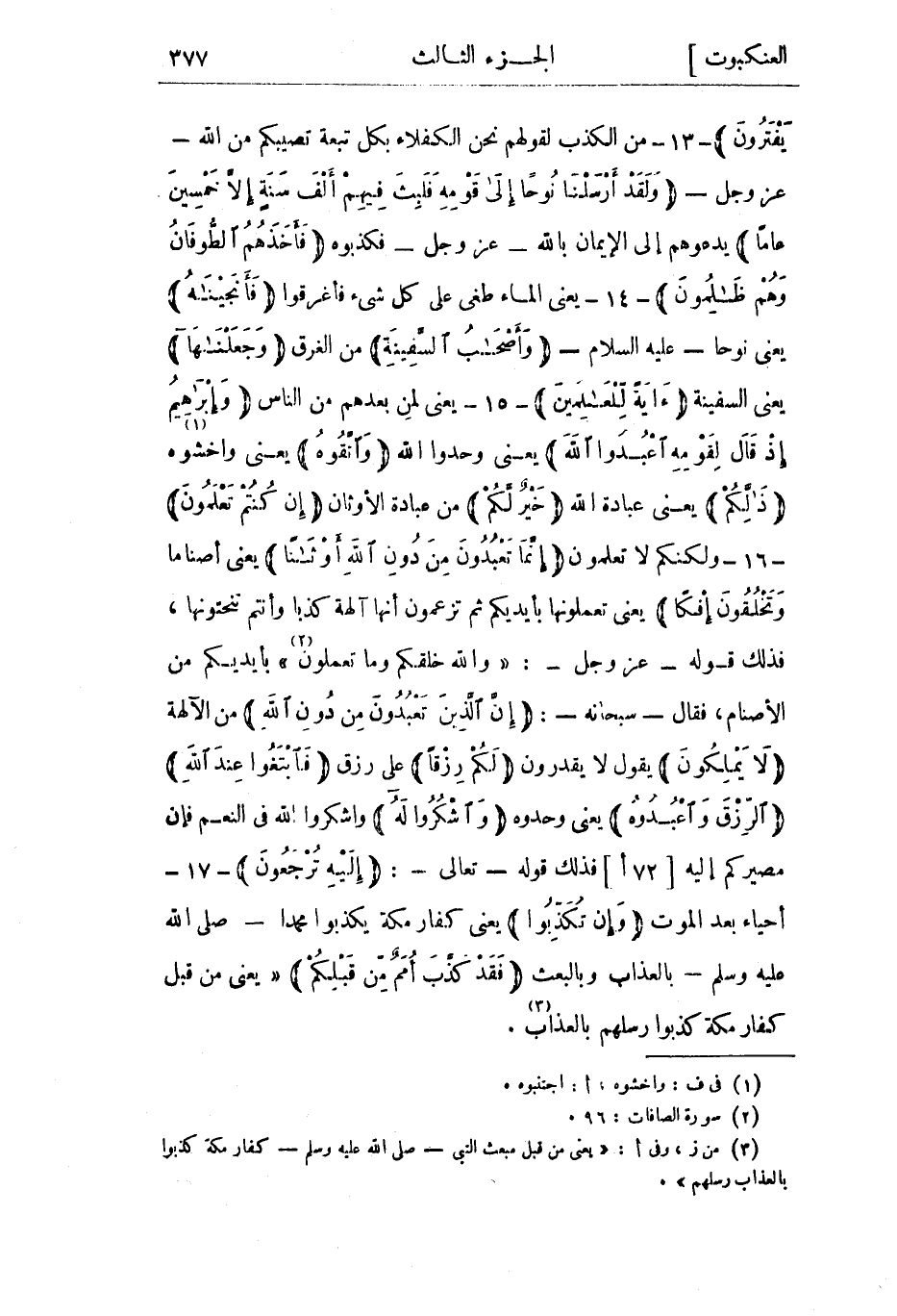 من الكذب لقولهم نحن الكفلاء بكل تبعة تصيبكم من الله- عز وجل- وَلَقَدْ أَرْسَلْنا نُوحاً إِلى قَوْمِهِ فَلَبِثَ فِيهِمْ أَلْفَ سَنَةٍ إِلَّا خَمْسِينَ عاماً يدعوهم إلى الإيمان بالله- عز وجل- فكذبوه فَأَخَذَهُمُ الطُّوفانُ وَهُمْ ظالِمُونَ- 14- يعني الماء طغى على كل شيء فأغرقوا فَأَنْجَيْناهُ يعني نوحا- عليه السلام- وَأَصْحابَ السَّفِينَةِ من الغرق وَجَعَلْناها يعني السفينة آيَةً لِلْعالَمِينَ- 15- يعني لمن بعدهم من الناس وَإِبْراهِيمَ إِذْ قالَ لِقَوْمِهِ اعْبُدُوا اللَّهَ يعني وحدوا الله وَاتَّقُوهُ يعني واخشوه «1» ذلِكُمْ يعني عبادة الله خَيْرٌ لَكُمْ من عبادة الأوثان إِنْ كُنْتُمْ تَعْلَمُونَ- 16- ولكنكم لا تعلمون إِنَّما تَعْبُدُونَ مِنْ دُونِ اللَّهِ أَوْثاناً يعنى أصناما وَتَخْلُقُونَ إِفْكاً يعنى تعلمونها بأيديكم ثم تزعمون أنها آلهة كذبا وأنتم تنحتونها، فذلك قوله- عز وجل-: «وَاللَّهُ خَلَقَكُمْ وَما تَعْمَلُونَ» «2» بأيديكم من الأصنام، فقال- سبحانه-: إِنَّ الَّذِينَ تَعْبُدُونَ مِنْ دُونِ اللَّهِ من الآلهة لا يَمْلِكُونَ يقول لا يقدرون لَكُمْ رِزْقاً على رزق فَابْتَغُوا عِنْدَ اللَّهِ الرِّزْقَ وَاعْبُدُوهُ يعني وحدوه وَاشْكُرُوا لَهُ واشكروا الله في النعم فإن مصيركم إليه [72 أ] فذلك قوله- تعالى-: إِلَيْهِ تُرْجَعُونَ- 17- أحياء بعد الموت وَإِنْ تُكَذِّبُوا يعنى كفار مكة يكذبوا محمدا- صلى الله عليه وسلم- بالعذاب وبالبعث فَقَدْ كَذَّبَ أُمَمٌ مِنْ قَبْلِكُمْ «يعني من قبل كفار مكة كذبوا رسلهم بالعذاب «3» .