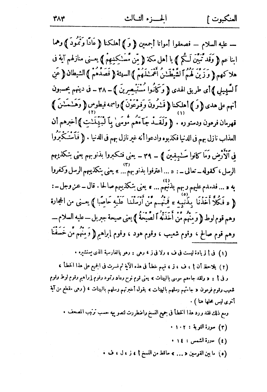 - عليه السلام- فصعقوا أمواتا أجمعين وَأهلكنا عاداً وَثَمُودَ وهما ابنا عم وَقَدْ تَبَيَّنَ لَكُمْ يا أهل مكة مِنْ مَساكِنِهِمْ يعني منازلهم آية في هلاكهم وَزَيَّنَ لَهُمُ الشَّيْطانُ أَعْمالَهُمْ السيئة فَصَدَّهُمْ الشيطان عَنِ السَّبِيلِ أي طريق الهدى وَكانُوا مُسْتَبْصِرِينَ- 38- في دينهم يحسبون أنهم على هدى وَأهلكنا قارُونَ وَفِرْعَوْنَ واسمه فيطوس وَهامانَ قهرمان فرعون ودستوره «1» . وَلَقَدْ جاءَهُمْ مُوسى بِالْبَيِّناتِ «2» أخبرهم أن العذاب نازل بهم في الدنيا فكذبوه وادعوا أنه غير نازل بهم في الدنيا. فَاسْتَكْبَرُوا فِي الْأَرْضِ وَما كانُوا سابِقِينَ- 39- يعني فتكبروا بذنوبهم يعني بتكذيبهم الرسل، كقوله- تعالى-: « ... اعْتَرَفُوا بِذُنُوبِهِمْ «3» ... » يعني بتكذيبهم الرسل وكفروا به « ... فَدَمْدَمَ عَلَيْهِمْ رَبُّهُمْ بِذَنْبِهِمْ «4» ... » يعني بتكذيبهم صالحا. قال- عز وجل-: