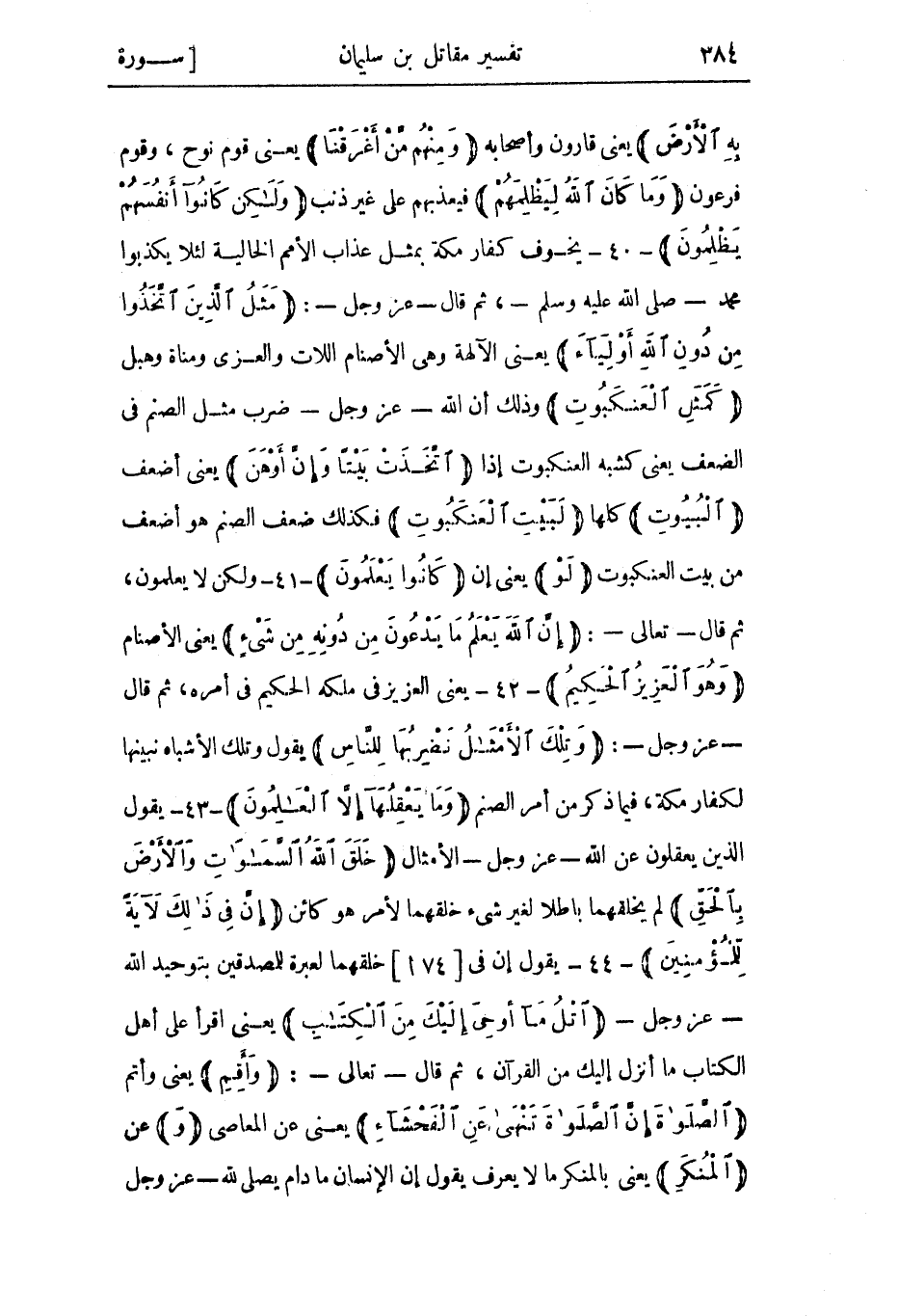 وَمِنْهُمْ مَنْ خَسَفْنا بِهِ الْأَرْضَ يعنى قارون وأصحابه وَمِنْهُمْ مَنْ أَغْرَقْنا يعني قوم نوح، وقوم فرعون وَما كانَ اللَّهُ لِيَظْلِمَهُمْ فيعذبهم على غير ذنب وَلكِنْ كانُوا أَنْفُسَهُمْ يَظْلِمُونَ- 40- يخوف كفار مكة بمثل عذاب الأمم الخالية لئلا يكذبوا محمد- صَلَّى اللَّهُ عَلَيْهِ وَسَلَّمَ-، ثُمّ قَالَ- عز وجل- مَثَلُ الَّذِينَ اتَّخَذُوا مِنْ دُونِ اللَّهِ أَوْلِياءَ يعني الآلهة وهي الأصنام اللات والعزى ومناة وهبل كَمَثَلِ الْعَنْكَبُوتِ وذلك أن الله- عز وجل- ضرب مثل الصنم في الضعف يعني كشبه العنكبوت إذا اتَّخَذَتْ بَيْتاً وَإِنَّ أَوْهَنَ يعني أضعف الْبُيُوتِ كلها لَبَيْتُ الْعَنْكَبُوتِ فكذلك ضعف الصنم هو أضعف من بيت العنكبوت لَوْ يعني إن كانُوا يَعْلَمُونَ- 41- ولكن لا يعلمون، ثم قال- تعالى-: إِنَّ اللَّهَ يَعْلَمُ ما يَدْعُونَ مِنْ دُونِهِ مِنْ شَيْءٍ يعني الأصنام وَهُوَ الْعَزِيزُ الْحَكِيمُ- 42- يعني العزيز في ملكه الحكيم في أمره، ثم قال- عز وجل-: وَتِلْكَ الْأَمْثالُ نَضْرِبُها لِلنَّاسِ يقول وتلك الأشباه نبينها لكفار مكة، فيما ذكر من أمر الصنم وَما يَعْقِلُها إِلَّا الْعالِمُونَ- 43- يقول الذين يعقلون عن الله- عز وجل- الأمثال خَلَقَ اللَّهُ السَّماواتِ وَالْأَرْضَ بِالْحَقِ