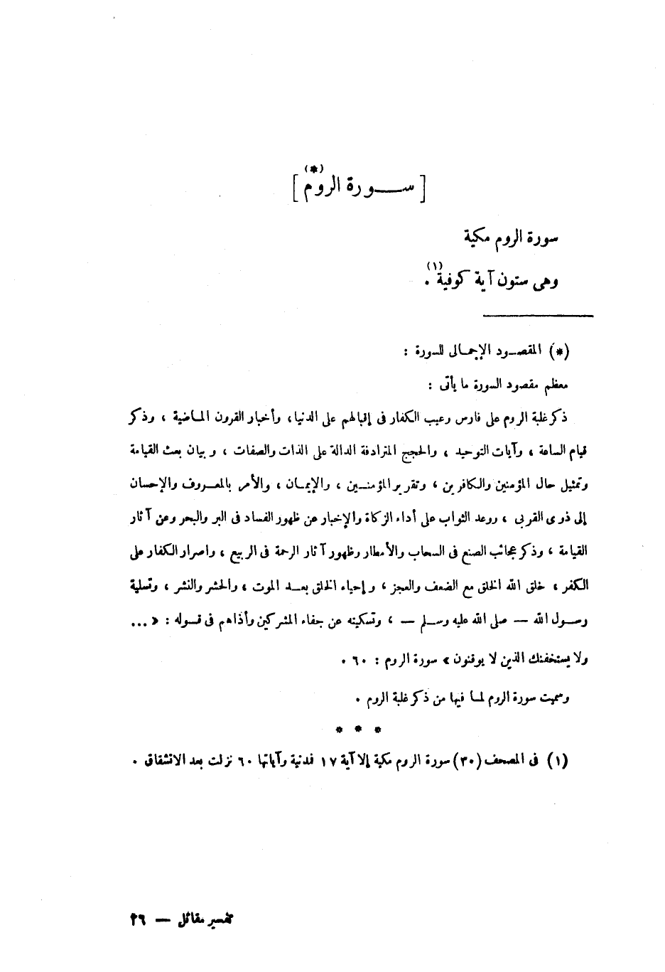 (2) فى المصحف (30) سورة الروم مكية إلا آية 17 فمدنية وآياتها 60 نزلت بعد الانشقاق.