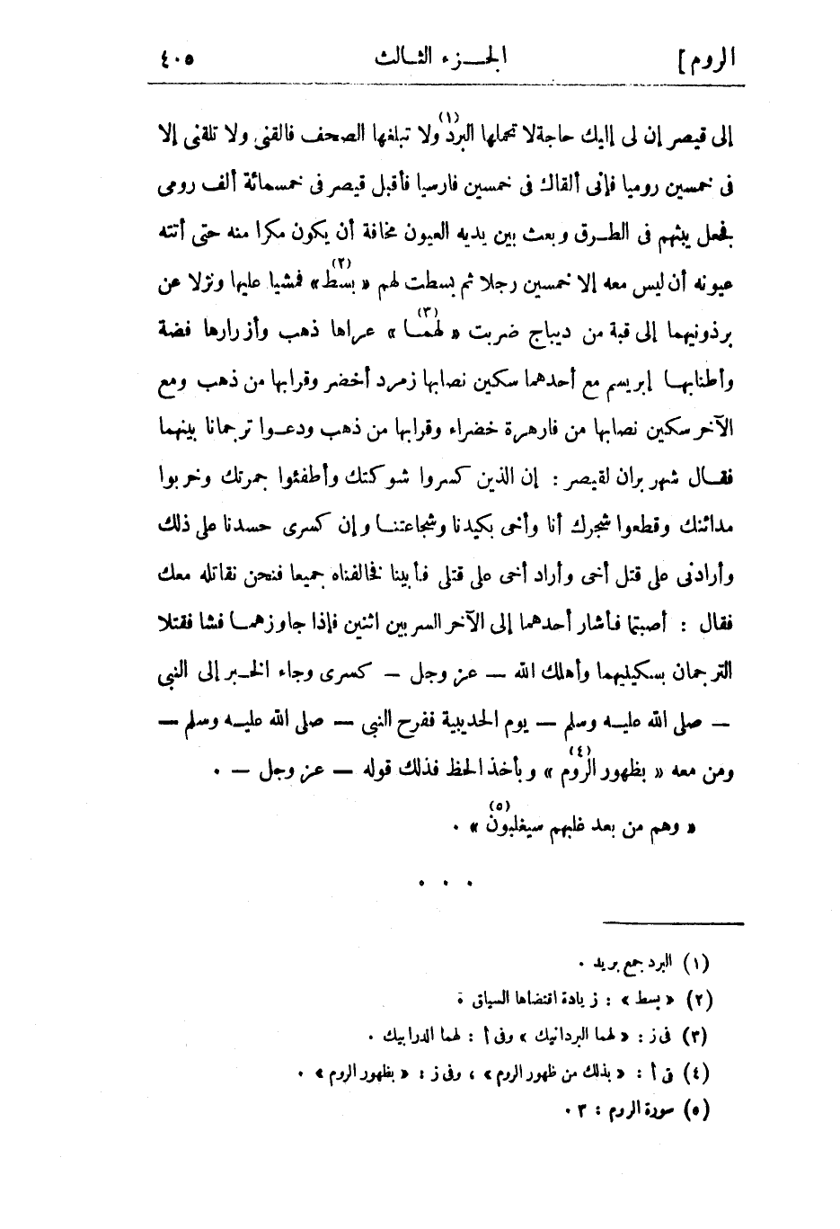 إِلَى قَيْصَرَ إِنَّ لِي إِلَيْكَ حَاجَةً لا تَحْمِلُهَا الْبُرُدُ «1» وَلا تَبْلُغُهَا الصُّحُفُ فَالْقَنِي وَلا تَلْقَنِي إِلا فِي خَمْسِينَ رُومِيًّا فَإِنِّي أَلْقَاكَ فى خمسين فارسيا فأقبل قيصر فى خمسمائة أَلْفِ رُومِيٍّ فَجَعَلَ يَبُثُّهُمْ فِي الطُّرُقِ وَبَعَثَ بَيْنَ يَدَيْهِ الْعُيُونَ مَخَافَةَ أَنْ يَكُونَ مَكْرًا مِنْهُ حَتَّى أَتَتْهُ عُيُونُهُ أَنْ لَيْسَ مَعَهُ إِلا خَمْسِينَ رَجُلا ثُمَّ بُسِطَتْ لَهُمْ «بُسُطٌ» «2» فَمَشَيَا عَلَيْهَا وَنَزَلا عَنْ بِرْذَوْنَيْهِمَا إِلَى قُبَّةٍ من ديباج ضربت «لهما» «3» عراها ذهب وَأَزْرَارُهَا فِضَّةٌ وَأَطْنَابُهَا إِبْرِيسِمُ مَعَ أَحَدِهِمَا سِكِّينٌ نصلبها زُمُرُّدٌ أَخْضَرُ وَقِرَابُهَا مِنْ ذَهَبٍ وَمَعَ الآخَرِ سكين نصابها من فارهرة خَضْرَاءَ وَقِرَابُهَا مِنْ ذَهَبٍ وَدَعَوْا تَرْجُمَانًا بَيْنَهُمَا فقال شهر بران لِقَيْصَرَ: إِنَّ الَّذِينَ كَسَرُوا شَوْكَتَكَ وَأَطْفَئُوا جَمْرَتَكَ وَخَرَّبُوا مَدَائِنَكَ وَقَطَّعُوا شَجَرَكَ أَنَا وَأَخِي بِكَيْدِنَا وَشَجَاعَتِنَا وَإِنَّ كِسْرَى حَسَدَنَا عَلَى ذَلِكَ وَأَرَادَنِي عَلَى قَتْلِ أَخِي وَأَرَادَ أَخِي عَلَى قَتْلِي فَأَبَيْنَا فَخَالَفْنَاهُ جَمِيعًا فَنَحْنُ نُقَاتِلُهُ مَعَكَ فَقَالَ: أَصَبْتُمَا فَأَشَارَ أَحَدُهُمَا إِلَى الآخَرِ السِّرُّ بَيْنَ اثْنَيْنِ فَإِذَا جَاوَزَهُمَا فَشَا فَقَتَلا التَّرْجُمَانَ بِسِكِّينَيْهِمَا وَأَهْلَكَ اللَّهُ- عَزَّ وَجَلَّ- كِسْرَى وَجَاءَ الْخَبَرُ إِلَى النَّبِيِّ- صَلَّى اللَّهُ عَلَيْهِ وَسَلَّمَ- يَوْمَ الْحُدَيْبِيَةِ فَفَرِحَ النَّبِيُّ- صَلَّى اللَّهُ عَلَيْهِ وَسَلَّمَ- ومن معه «بظهور الروم» «4» وبأخذ الحظ فَذَلِكَ قَوْلُهُ- عَزَّ وَجَلَّ-.