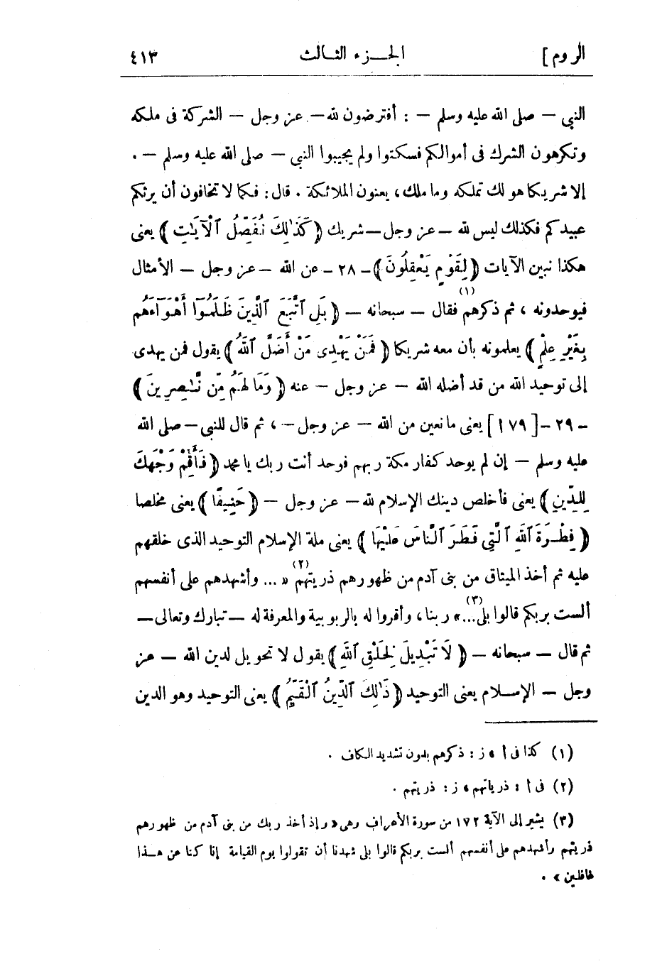 (3) يشير إلى الآية 72 امن سورة الأعراف وهي «وَإِذْ أَخَذَ رَبُّكَ مِنْ بَنِي آدَمَ مِنْ ظُهُورِهِمْ ذُرِّيَّتَهُمْ وَأَشْهَدَهُمْ عَلى أَنْفُسِهِمْ أَلَسْتُ بِرَبِّكُمْ قالُوا بَلى شَهِدْنا أَنْ تَقُولُوا يَوْمَ الْقِيامَةِ إِنَّا كُنَّا عَنْ هذا غافِلِينَ» . [.....]