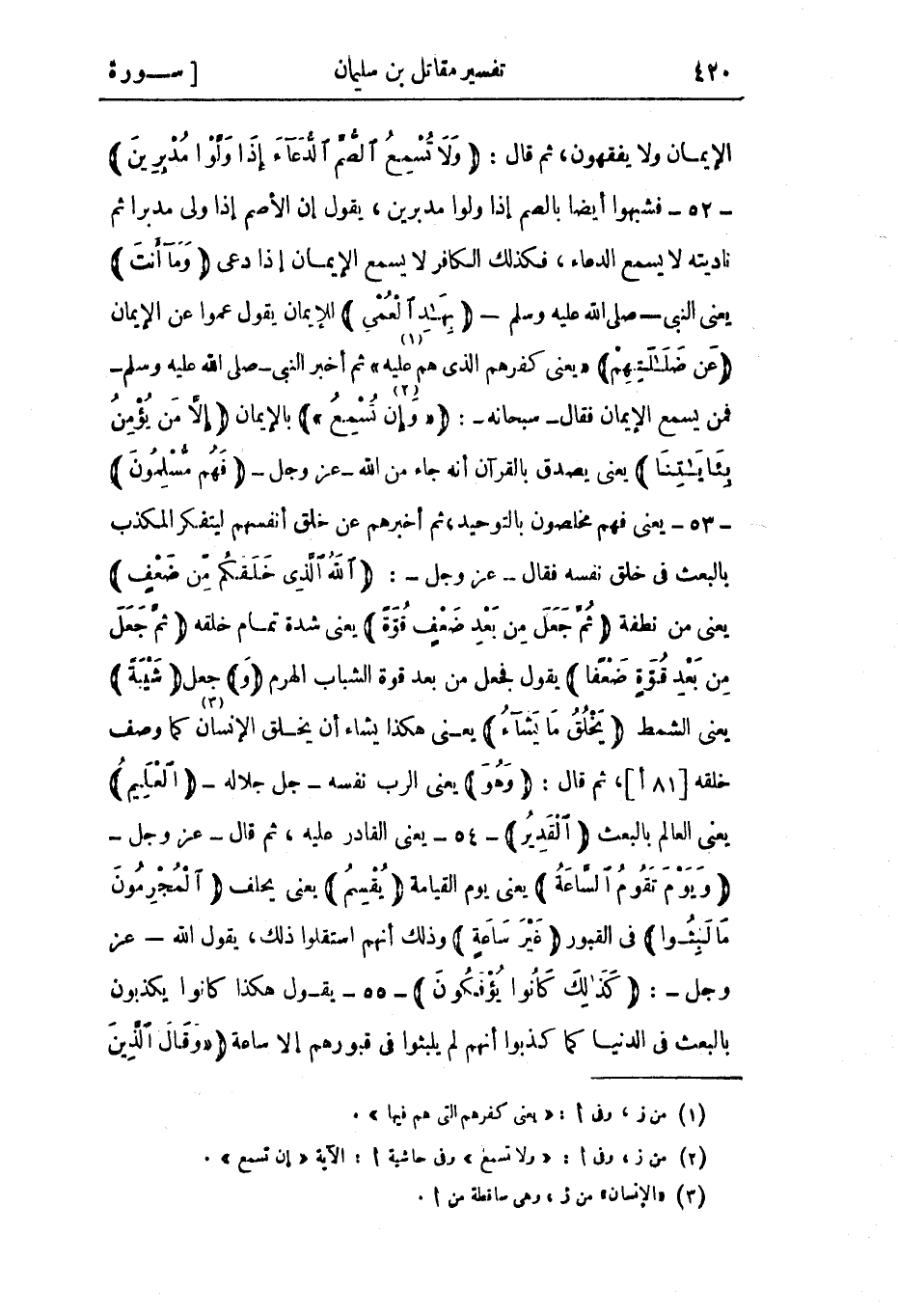 الإيمان ولا يفقهون، ثم قال: وَلا تُسْمِعُ الصُّمَّ الدُّعاءَ إِذا وَلَّوْا مُدْبِرِينَ- 52- فشبهوا أيضا بالصم إذا ولوا مدبرين، يقول إن الأصم إذا ولى مدبرا ثم ناديته لا يسمع الدعاء، فكذلك الكافر لا يسمع الإيمان إذا دعى وَما أَنْتَ يعنى النبي- صلى الله عليه وسلم- بِهادِ الْعُمْيِ للإيمان يقول عموا عن الإيمان عَنْ ضَلالَتِهِمْ «يعني كفرهم الذي هم عليه» «1» ثم أخبر النبي- صلّى الله عليه وآله وسلّم- فمن يسمع الإيمان فقال- سبحانه-: «إِنْ تُسْمِعُ» «2» بالإيمان إِلَّا مَنْ يُؤْمِنُ بِآياتِنا يعني يصدق بالقرآن أنه جاء من الله- عز وجل-: فَهُمْ مُسْلِمُونَ- 53- يعنى فهم مخلصون بالتوحيد، ثم أخبرهم عن خلق أنفسهم ليتفكر المكذب بالبعث في خلق نفسه فقال- عز وجل-: اللَّهُ الَّذِي خَلَقَكُمْ مِنْ ضَعْفٍ يعني من نطفة ثُمَّ جَعَلَ مِنْ بَعْدِ ضَعْفٍ قُوَّةً يعني شدة تمام خلقه ثُمَّ جَعَلَ مِنْ بَعْدِ قُوَّةٍ ضَعْفاً يقول فجعل من بعد قوة الشباب الهرم وَجعل شَيْبَةً يعنى الشمط يَخْلُقُ ما يَشاءُ يعني هكذا يشاء أن يخلق الإنسان «3» كما وصف خلقه [81 أ] ، ثم قال: وَهُوَ يعني الرب نفسه- جل جلاله- الْعَلِيمُ يعني العالم بالبعث الْقَدِيرُ- 54- يعني القادر عليه، ثم قال- عز وجل- وَيَوْمَ تَقُومُ السَّاعَةُ يعني يوم القيامة يُقْسِمُ يعني يحلف الْمُجْرِمُونَ ما لَبِثُوا فى القبور غَيْرَ ساعَةٍ وذلك أنهم استقلوا ذلك، يقول الله- عز وجل-: كَذلِكَ كانُوا يُؤْفَكُونَ- 55- يقول هكذا كانوا يكذبون بالبعث في الدنيا كما كذبوا أنهم لم يلبثوا في قبورهم إلا ساعة