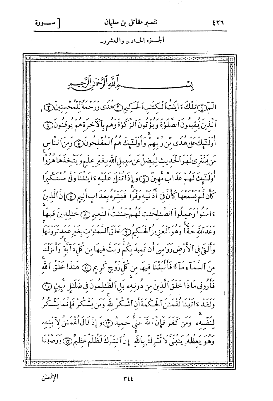 الم (1) تِلْكَ آياتُ الْكِتابِ الْحَكِيمِ (2) هُدىً وَرَحْمَةً لِلْمُحْسِنِينَ (3) الَّذِينَ يُقِيمُونَ الصَّلاةَ وَيُؤْتُونَ الزَّكاةَ وَهُمْ بِالْآخِرَةِ هُمْ يُوقِنُونَ (4)