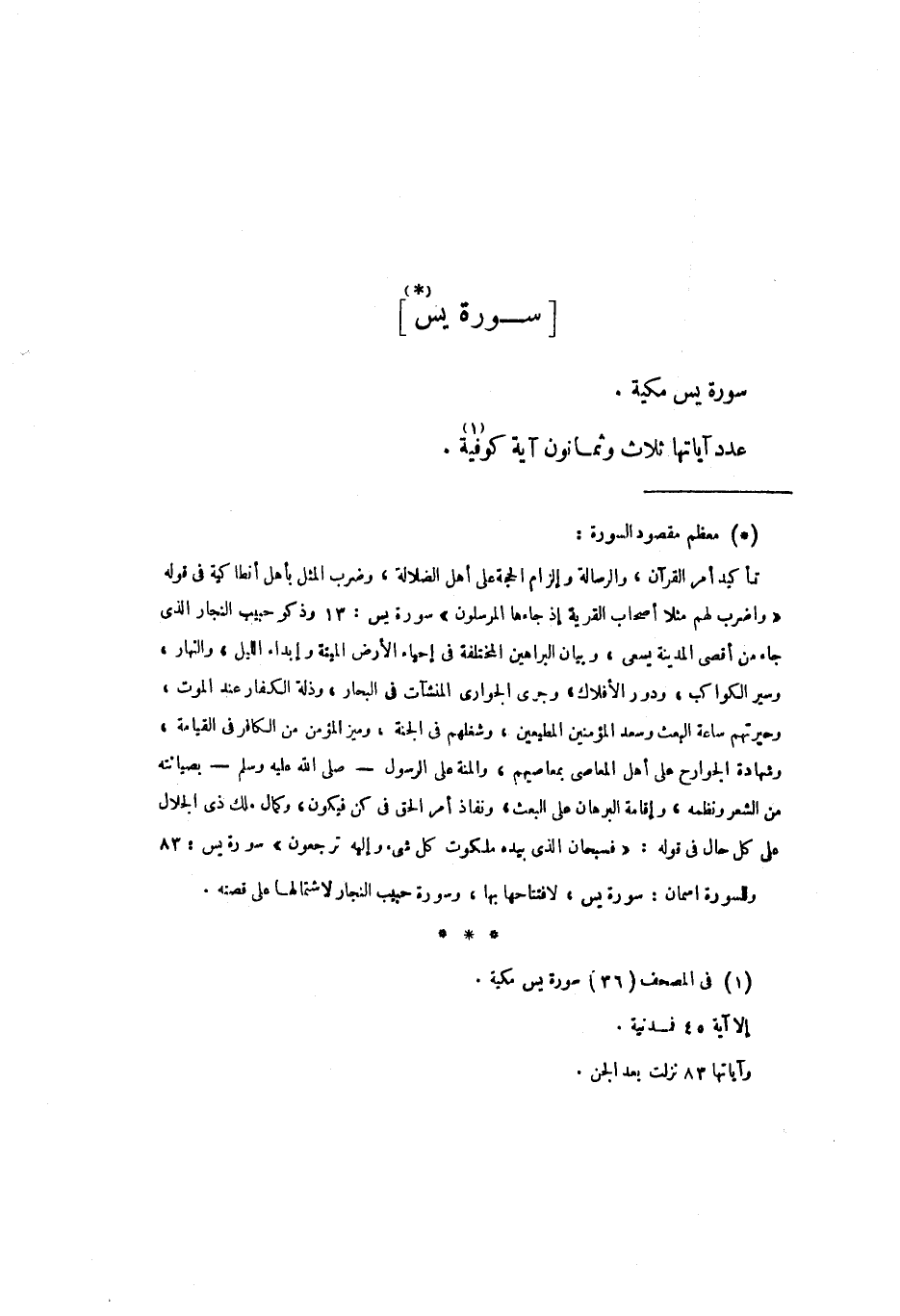 تأكيد أمر القرآن، والرسالة وإلزام الحجة على أهل الضلالة، وضرب المثل بأهل أنطاكية فى قوله «وَاضْرِبْ لَهُمْ مَثَلًا أَصْحابَ الْقَرْيَةِ إِذْ جاءَهَا الْمُرْسَلُونَ» سورة يس: 13 وذكر حبيب النجار الذي جاء من أقصى المدينة يسعى، وبيان البراهين المختلفة فى إحياء الأرض الميتة وإبداء الليل، والنهار، وسير الكواكب، ودور الأفلاك، وجرى الجواري المنشئات فى البحار، وذلة الكفار عند الموت، وحيرتهم ساعة البعث وسعد المؤمنين المطيعين، وشغلهم فى الجنة، وميز المؤمن من الكافر فى القيامة، وشهادة الجوارح على أهل المعاصي بمعاصيهم، والمنة على الرسول- صلى الله عليه وسلم- بصيانته من الشعر ونظمه، وإقامة البرهان على البعث، ونفاذ أمر الحق فى كن فيكون، وكمال ملك ذى الجلال على كل حال فى قوله: «فَسُبْحانَ الَّذِي بِيَدِهِ مَلَكُوتُ كُلِّ شَيْءٍ وَإِلَيْهِ تُرْجَعُونَ» سورة يس: 83.