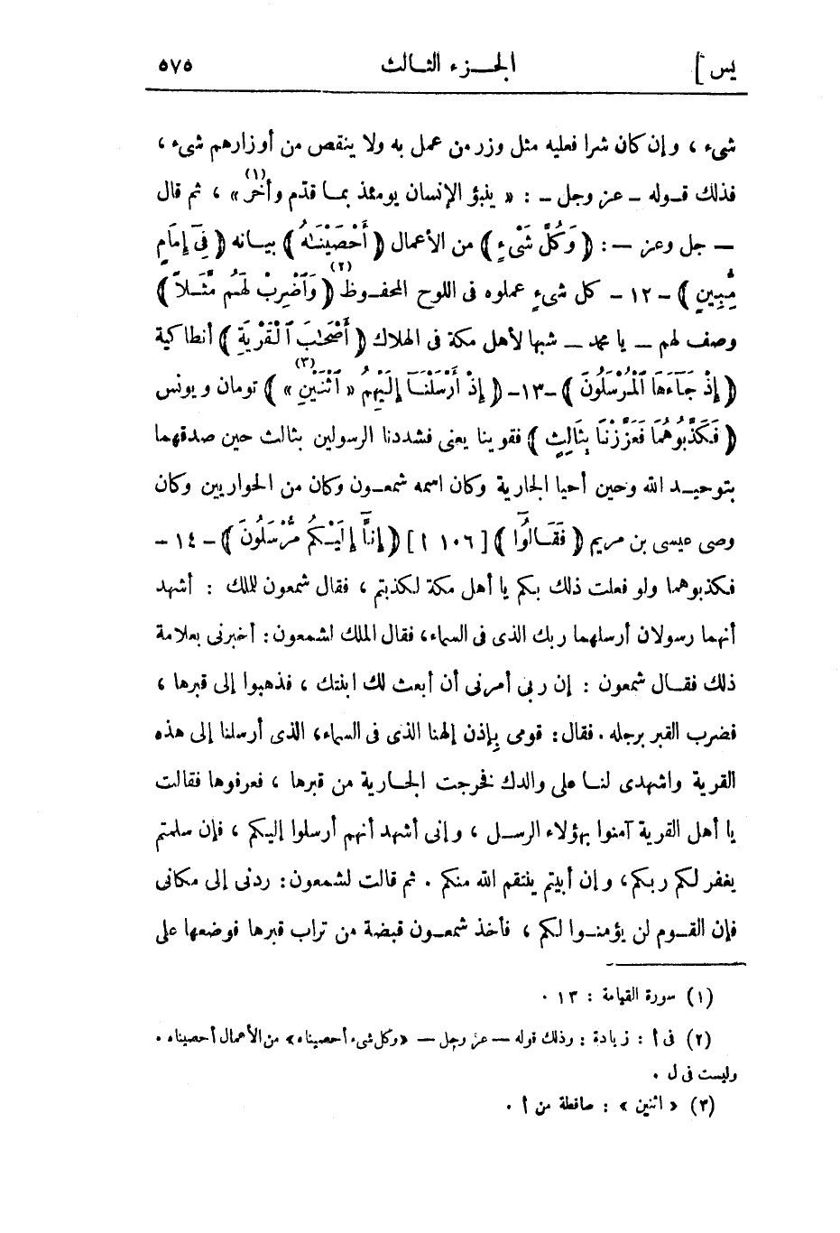 «1» ، ثم قال- جل وعز-: وَكُلَّ شَيْءٍ من الأعمال أَحْصَيْناهُ بيانه فِي إِمامٍ مُبِينٍ- 12- كل شيء عملوه في اللوح المحفوظ «2» وَاضْرِبْ لَهُمْ مَثَلًا وصف لهم- يا محمد- شبها لأهل مكة في الهلاك أَصْحابَ الْقَرْيَةِ أنطاكية إِذْ جاءَهَا الْمُرْسَلُونَ- 13- إِذْ أَرْسَلْنا إِلَيْهِمُ «اثْنَيْنِ» «3» تومان ويونس فَكَذَّبُوهُما فَعَزَّزْنا بِثالِثٍ فقوينا يعني فشددنا الرسولين بثالث حين صدقهما بتوحيد الله وحين أحيا الجارية وكان اسمه شمعون وكان من الحواريين وكان وصى عيسى بن مريم فَقالُوا [106 أ] إِنَّا إِلَيْكُمْ مُرْسَلُونَ- 14- فكذبوهما ولو فعلت ذلك بكم يا أهل مكة لكذبتم، فقال شمعون للملك: أشهد أنهما رسولان أرسلهما ربك الذي في السماء، فقال الملك لشمعون: أخبرني بعلامة ذلك فقال شمعون: إن ربي أمرني أن أبعث لك ابنتك، فذهبوا إلى قبرها، فضرب القبر برجله. فقال: قومي بإذن إلهنا الذي في السماء، الذي أرسلنا إلى هذه القرية واشهدي لنا على والدك فخرجت الجارية من قبرها، فعرفوها فقالت يا أهل القرية آمنوا بهؤلاء الرسل، وإنى أشهد أنهم أرسلوا إليكم، فإن سلمتم يغفر لكم ربكم، وإن أبيتم ينتقم الله منكم. ثم قالت لشمعون: ردني إلى مكاني فإن القوم لن يؤمنوا لكم، فأخذ شمعون قبضة من تراب قبرها فوضعها على