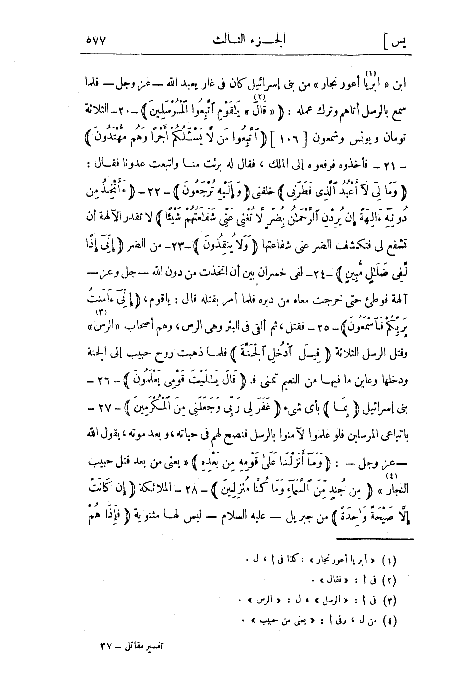 ابن «أبريا «1» أعور نجار» من بني إسرائيل كان في غار يعبد الله- عز وجل- فلما سمع بالرسل أتاهم وترك عمله: «قالَ» «2» يَا قَوْمِ اتَّبِعُوا الْمُرْسَلِينَ- 20- الثلاثة تومان ويونس وشمعون [106] اتَّبِعُوا مَنْ لا يَسْئَلُكُمْ أَجْراً وَهُمْ مُهْتَدُونَ- 21- فأخذوه فرفعوه إلى الملك، فقال له برئت منا واتبعت عدونا فقال:
