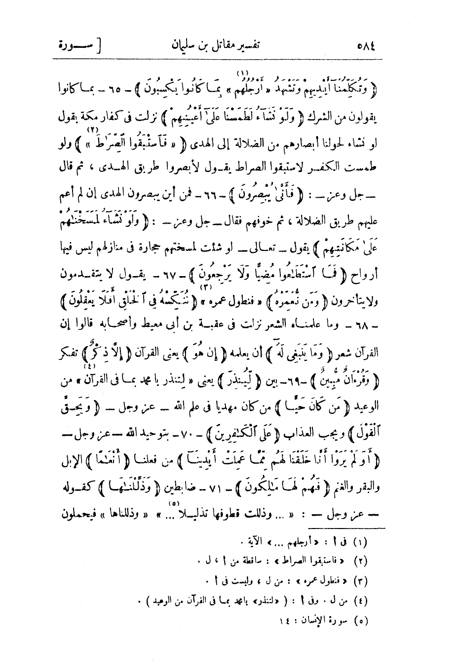 وَتُكَلِّمُنا أَيْدِيهِمْ وَتَشْهَدُ «أَرْجُلُهُمْ» «1» بِما كانُوا يَكْسِبُونَ- 65- بما كانوا يقولون من الشرك وَلَوْ نَشاءُ لَطَمَسْنا عَلى أَعْيُنِهِمْ نزلت فى كفار مكة بقول لو نشاء لحولنا أبصارهم من الضلالة إلى الهدى «فَاسْتَبَقُوا الصِّراطَ» «2» ولو طمست الكفر لاستبقوا الصراط يقول لأبصروا طريق الهدى، ثم قال- جل وعز-: فَأَنَّى يُبْصِرُونَ- 66- فمن أين يبصرون الهدى إن لم أعم عليهم طريق الضلالة، ثم خوفهم فقال- جل وعز-: وَلَوْ نَشاءُ لَمَسَخْناهُمْ عَلى مَكانَتِهِمْ يقول- تعالى- لو شئت لمسختهم حجارة في منازلهم ليس فيها أرواح فَمَا اسْتَطاعُوا مُضِيًّا وَلا يَرْجِعُونَ- 67- يقول لا يتقدمون ولا يتأخرون وَمَنْ نُعَمِّرْهُ «فنطول عمره» «3» نُنَكِّسْهُ فِي الْخَلْقِ أَفَلا يَعْقِلُونَ- 68- وما علمناه الشعر نزلت في عقبة بن أبي معيط وأصحابه قالوا إن القرآن شعر وَما يَنْبَغِي لَهُ أن يعلمه إِنْ هُوَ يعني القرآن إِلَّا ذِكْرٌ تفكر وَقُرْآنٌ مُبِينٌ- 69- بين لِيُنْذِرَ يعني «لتنذر يا محمد بما في القرآن» «4» من الوعيد مَنْ كانَ حَيًّا من كان مهديا في علم الله- عز وجل- وَيَحِقَّ الْقَوْلُ ويجب العذاب عَلَى الْكافِرِينَ- 70- بتوحيد الله- عز وجل- أَوَلَمْ يَرَوْا أَنَّا خَلَقْنا لَهُمْ مِمَّا عَمِلَتْ أَيْدِينا من فعلنا أَنْعاماً الإبل والبقر والغنم فَهُمْ لَها مالِكُونَ- 71- ضابطين وَذَلَّلْناها كقوله- عز وجل-: « ... وَذُلِّلَتْ قُطُوفُها تَذْلِيلًا «5» ... » «وذللناها» فيحملون