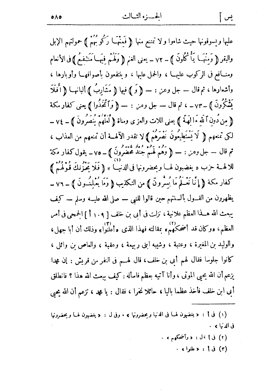 عليها ويسوقونها حيث شاءوا ولا تمتنع منها فَمِنْها رَكُوبُهُمْ حمولتهم الإبل والبقر وَمِنْها يَأْكُلُونَ- 72- يعني الغنم وَلَهُمْ فِيها مَنافِعُ في الأنعام ومنافع في الركوب عليها، والحمل عليها، وينتفعون بأصوافها وأوبارها، وأشعارها، ثم قال- جل وعز-: وَفيها مَشارِبُ ألبانها أَفَلا يَشْكُرُونَ- 73-، ثم قال- جل وعز: - وَاتَّخَذُوا يعني كفار مكة مِنْ دُونِ اللَّهِ آلِهَةً يعني اللات والعزى ومناة لَعَلَّهُمْ يُنْصَرُونَ- 74- لكي تمنعهم لا يَسْتَطِيعُونَ نَصْرَهُمْ لا تقدر الآلهة أن تمنعهم من العذاب، ثم قال- جل وعز: - وَهُمْ لَهُمْ جُنْدٌ مُحْضَرُونَ- 75- يقول كفار مكة للآلهة حزب «يغضبون لها ويحضرونها فى الدنيا» «1» فَلا يَحْزُنْكَ قَوْلُهُمْ كفار مكة إِنَّا نَعْلَمُ ما يُسِرُّونَ من التكذيب وَما يُعْلِنُونَ- 76- يظهرون من القول بألسنتهم حين قالوا للنبي- صلى الله عليه وسلم- كيف يبعث الله هذا العظم علانية، نزلت فى أبى بن خلف [109 أ] الجمحي في أمر العظم، «وكان قد أضحكهم» «2» بمقالته فهذا الذي «أعلنوا» «3» وذلك أن أبا جهل، والوليد بن المغيرة، وعتبة، وشيبة ابني ربيعة، وعقبة، والعاص بن وائل، كانوا جلوسا فقال لهم أبي بن خلف،