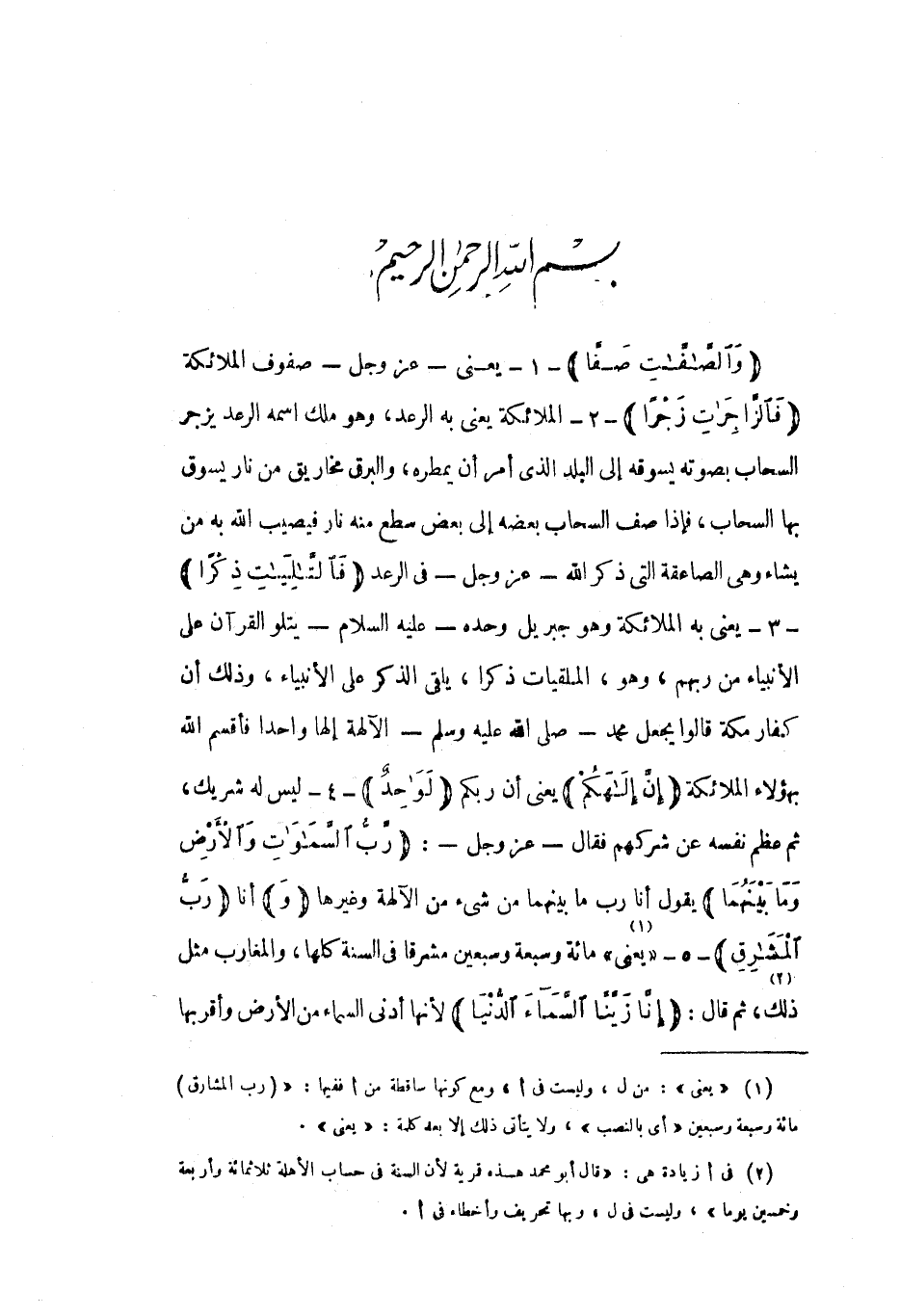 بِسْمِ اللَّهِ الرَّحْمنِ الرَّحِيمِ وَالصَّافَّاتِ صَفًّا- 1- يعني- عز وجل- صفوف الملائكة فَالزَّاجِراتِ زَجْراً- 2- الملائكة يعني به الرعد، وهو ملك اسمه الرعد يزجر السحاب بصوته يسوقه إلى البلد الذي أمر أن يمطره، والبرق مخاريق من نار يسوق بها السحاب، فإذا صف السحاب بعضه إلى بعض سطع منه نار فيصيب الله به من يشاء وهي الصاعقة التي ذكر الله- عز وجل- في الرعد فَالتَّالِياتِ ذِكْراً- 3- يعني به الملائكة وهو جبريل وحده- عليه السلام- يتلو القرآن على الأنبياء من ربهم، وهو، الملقيات ذكرا، يلقي الذكر على الأنبياء، وذلك أن كفار مكة قالوا يجعل محمد- صلى الله عليه وسلم- الآلهة إلها واحدا فأقسم الله بهؤلاء الملائكة إِنَّ إِلهَكُمْ يعني أن ربكم لَواحِدٌ- 4- ليس له شريك، ثم عظم نفسه عن شركهم فقال- عز وجل-: رَبُّ السَّماواتِ وَالْأَرْضِ وَما بَيْنَهُما يقول أنا رب ما بينهما من شيء من الآلهة وغيرها وَأنا رَبُّ الْمَشارِقِ- 5- «يعني» «1» مائة وسبعة وسبعين مشرقا في السنة كلها، والمغارب مثل ذلك، «2» ثم قال: إِنَّا زَيَّنَّا السَّماءَ الدُّنْيا لأنها أدنى السماء من الأرض وأقربها