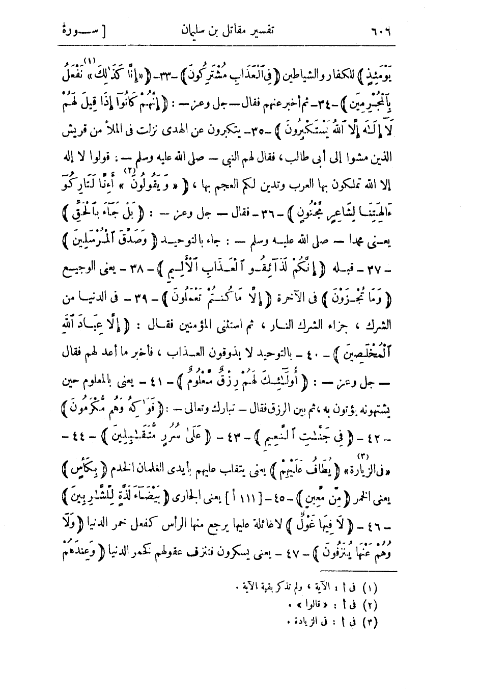 للكفار والشياطين فِي الْعَذابِ مُشْتَرِكُونَ- 33- «إِنَّا كَذلِكَ» «1» نَفْعَلُ بِالْمُجْرِمِينَ- 34- ثم أخبر عنهم فقال- جل وعز-: إِنَّهُمْ كانُوا إِذا قِيلَ لَهُمْ لا إِلهَ إِلَّا اللَّهُ يَسْتَكْبِرُونَ- 35- يتكبرون عن الهدى نزلت في الملأ من قريش الذين مشوا إلى أبي طالب، فقال لهم النبي- صلى الله عليه وسلم-: قولوا لا إله إلا الله تملكون بها العرب وتدين لكم العجم بها، «وَيَقُولُونَ» «2» أَإِنَّا لَتارِكُوا آلِهَتِنا لِشاعِرٍ مَجْنُونٍ- 36- فقال- جل وعز-: بَلْ جاءَ بِالْحَقِّ يعني محمدا- صلى الله عليه وسلم-: جاء بالتوحيد وَصَدَّقَ الْمُرْسَلِينَ- 37- قبله إِنَّكُمْ لَذائِقُوا الْعَذابِ الْأَلِيمِ- 38- يعني الوجيع وَما تُجْزَوْنَ في الآخرة إِلَّا ما كُنْتُمْ تَعْمَلُونَ- 39- في الدنيا من الشرك، جزاء الشرك النار، ثم استثنى المؤمنين فقال: إِلَّا عِبادَ اللَّهِ الْمُخْلَصِينَ- 40- بالتوحيد لا يذوقون العذاب، فأخبر ما أعد لهم فقال- جل وعز-: أُولئِكَ لَهُمْ رِزْقٌ مَعْلُومٌ- 41- يعني بالمعلوم حين يشتهونه يؤتون به، ثم بين الرزق فقال- تبارك وتعالى-: فَواكِهُ وَهُمْ مُكْرَمُونَ- 42- فِي جَنَّاتِ النَّعِيمِ- 43- عَلى سُرُرٍ مُتَقابِلِينَ- 44- «في الزيارة» «3» يُطافُ عَلَيْهِمْ يعني يتقلب عليهم بأيدي الغلمان الخدم بِكَأْسٍ يعني الخمر مِنْ مَعِينٍ- 45-[111 أ] يعنى الجاري بَيْضاءَ لَذَّةٍ لِلشَّارِبِينَ- 46- لا فِيها غَوْلٌ لا غائلة عليها يرجع منها الرأس كفعل خمر الدنيا وَلا هُمْ عَنْها يُنْزَفُونَ- 47- يعنى يسكرون فتنزف عقولهم كخمر الدنيا