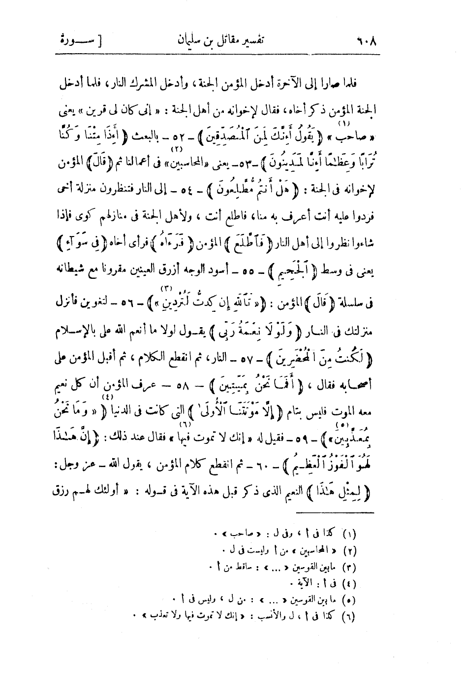 فلما صارا إلى الآخرة أدخل المؤمن الجنة، وأدخل المشرك النار، فلما أدخل الجنة المؤمن ذكر أخاه، فقال لإخوانه من أهل الجنة: «إِنِّي كانَ لِي قَرِينٌ» يعنى «صاحب» «1» يَقُولُ أَإِنَّكَ لَمِنَ الْمُصَدِّقِينَ- 52- بالبعث أَإِذا مِتْنا وَكُنَّا تُراباً وَعِظاماً أَإِنَّا لَمَدِينُونَ- 53- يعنى «المحاسبين» «2» في أعمالنا ثم قالَ المؤمن لإخوانه في الجنة: هَلْ أَنْتُمْ مُطَّلِعُونَ- 54- إلى النار فتنظرون منزلة أخي فردوا عليه أنت أعرف به منا، فاطلع أنت، ولأهل الجنة في منازلهم كوى فإذا شاءوا نظروا إلى أهل النار فَاطَّلَعَ المؤمن فَرَآهُ فرأى أخاه فِي سَواءِ يعني في وسط الْجَحِيمِ- 55- أسود الوجه أزرق العينين مقرونا مع شيطانه في سلسلة قالَ المؤمن: «تَاللَّهِ إِنْ كِدْتَ لَتُرْدِينِ» «3» - 56- لتغوين فأنزل منزلتك فى النار وَلَوْلا نِعْمَةُ رَبِّي يقول لولا ما انعم الله علي بالإسلام لَكُنْتُ مِنَ الْمُحْضَرِينَ- 57- النار، ثم انقطع الكلام، ثم أقبل المؤمن على أصحابه فقال: أَفَما نَحْنُ بِمَيِّتِينَ- 58- عرف المؤمن أن كل نعيم معه الموت فليس بتام إِلَّا مَوْتَتَنَا الْأُولى التي كانت في الدنيا «4» «وَما نَحْنُ بِمُعَذَّبِينَ» «5» - 59- فقيل له «إنك لا تموت فيها» «6» فقال عند ذلك: إِنَّ هَذَا لَهُوَ الْفَوْزُ الْعَظِيمُ- 60- ثم انقطع كلام المؤمن، يقول الله- عز وجل: