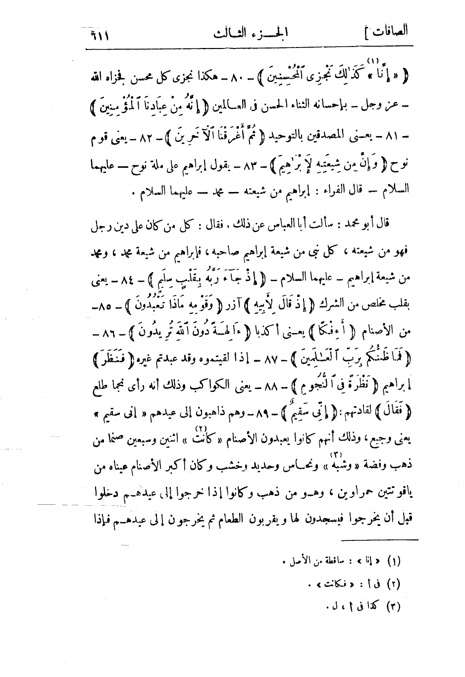 «إِنَّا» «1» كَذلِكَ نَجْزِي الْمُحْسِنِينَ- 80- هكذا نجزي كل محسن فجزاه الله- عز وجل- بإحسانه الثناء الحسن في العالمين إِنَّهُ مِنْ عِبادِنَا الْمُؤْمِنِينَ- 81- يعنى المصدقين بالتوحيد ثُمَّ أَغْرَقْنَا الْآخَرِينَ- 82- يعني قوم نوح وَإِنَّ مِنْ شِيعَتِهِ لَإِبْراهِيمَ- 83- يقول إبراهيم على ملة نوح- عليهما السلام- قال الفراء: إبراهيم من شيعته- محمد- عليهما السلام.