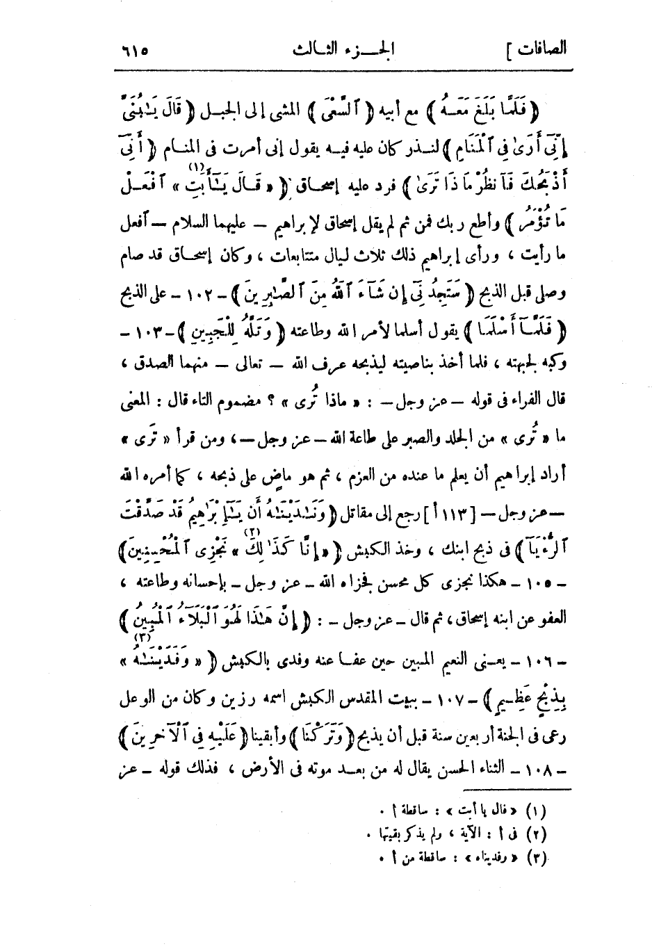 فَلَمَّا بَلَغَ مَعَهُ مع أبيه السَّعْيَ المشي إلى الجبل قالَ يا بُنَيَّ إِنِّي أَرى فِي الْمَنامِ لنذر كان عليه فيه يقول إني أمرت في المنام أَنِّي أَذْبَحُكَ فَانْظُرْ ماذا تَرى فرد عليه إسحاق «قالَ يَا أَبَتِ «1» » افْعَلْ ما تُؤْمَرُ وأطع ربك فمن ثم لم يقل إسحاق لإبراهيم- عليهما السلام- افعل ما رأيت، ورأى إبراهيم ذلك ثلاث ليال متتابعات، وكان إسحاق قد صام وصلى قبل الذبح سَتَجِدُنِي إِنْ شاءَ اللَّهُ مِنَ الصَّابِرِينَ- 102- على الذبح فَلَمَّا أَسْلَما يقول أسلما لأمر الله وطاعته وَتَلَّهُ لِلْجَبِينِ- 103- وكبه لجبهته، فلما أخذ بناصيته ليذبحه عرف الله- تعالى- منهما الصدق، قال الفراء في قوله- عز وجل-: «ماذا ترى» ؟ مضموم التاء قال: المعنى ما «ترى» من الجلد والصبر على طاعة الله- عز وجل-، ومن قرأ «ترى» أراد إبراهيم أن يعلم ما عنده من العزم، ثم هو ماض على ذبحه، كما أمره الله- عز وجل-[113 أ] رجع إلى مُقَاتِلٍ وَنادَيْناهُ أَنْ يَا إِبْراهِيمُ قَدْ صَدَّقْتَ الرُّؤْيا في ذبح ابنك، وخذ الكبش «إِنَّا كَذلِكَ»