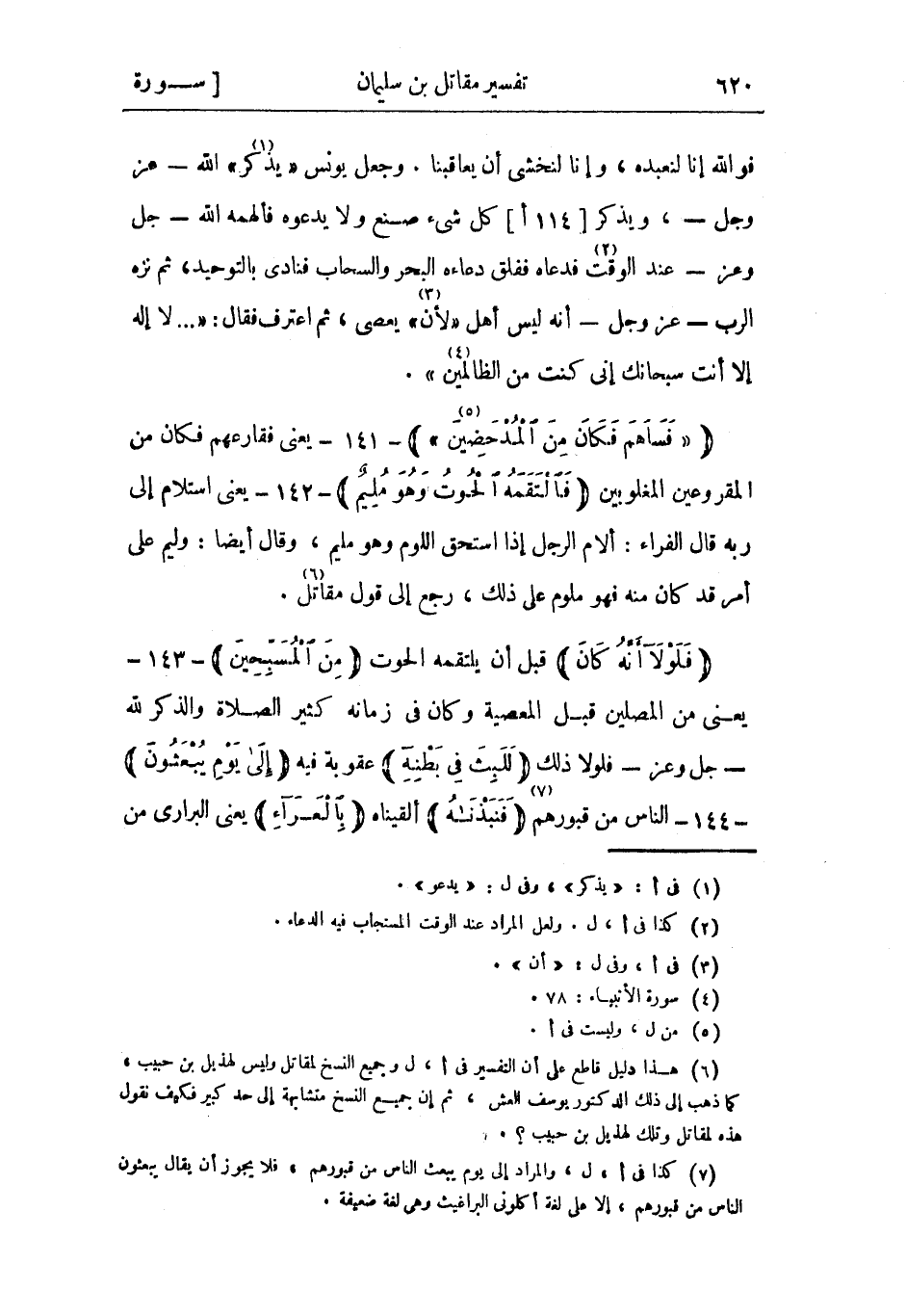 (6) هذا دليل قاطع على أن التفسير فى أ، ل وجميع النسخ لمقاتل وليس لهذيل بن حبيب، كما ذهب إلى ذلك الدكتور يوسف العش، ثم إن جميع النسخ متشابهة إلى حد كبير فكيف نقول هذه لمقاتل وتلك لهذيل بن حبيب؟.