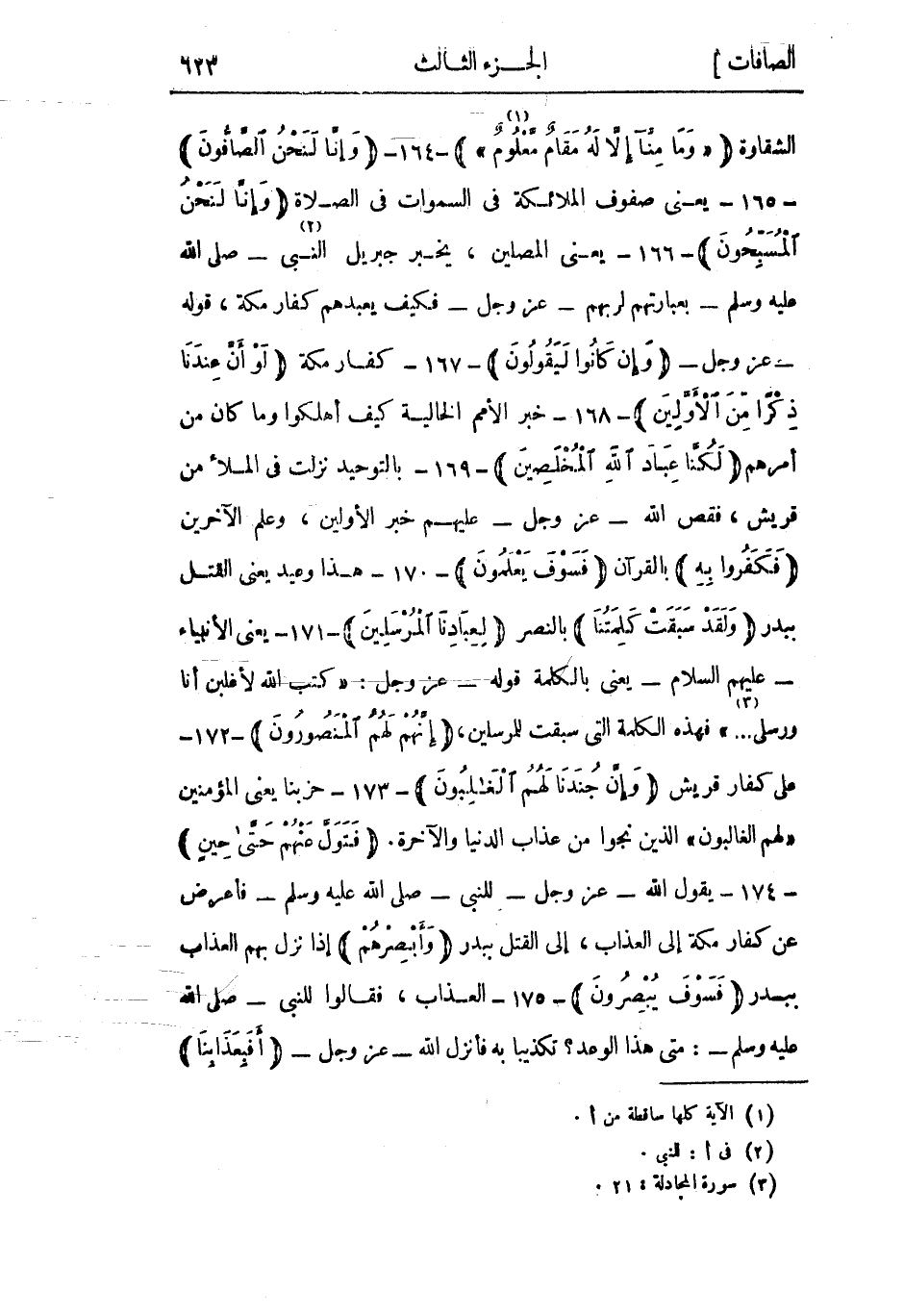 الشقاوة «وَما مِنَّا إِلَّا لَهُ مَقامٌ مَعْلُومٌ» «1» - 164- وَإِنَّا لَنَحْنُ الصَّافُّونَ- 165- يعني صفوف الملائكة في السموات في الصلاة وَإِنَّا لَنَحْنُ الْمُسَبِّحُونَ- 166- يعني المصلين، يخبر جبريل النبي «2» - صلى الله عليه وسلم- بعبارتهم لربهم- عز وجل- فكيف يعبدهم كفار مكة، قوله- عز وجل- وَإِنْ كانُوا لَيَقُولُونَ- 167- كفار مكة لَوْ أَنَّ عِنْدَنا ذِكْراً مِنَ الْأَوَّلِينَ- 168- خبر الأمم الخالية كيف أهلكوا وما كان من أمرهم لَكُنَّا عِبادَ اللَّهِ الْمُخْلَصِينَ- 169- بالتوحيد نزلت فى الملأ من قريش، فقص الله- عز وجل- عليهم خبر الأولين، وعلم الآخرين فَكَفَرُوا بِهِ بالقرآن فَسَوْفَ يَعْلَمُونَ- 170- هذا وعيد يعني القتل ببدر وَلَقَدْ سَبَقَتْ كَلِمَتُنا بالنصر لِعِبادِنَا الْمُرْسَلِينَ- 171- يعني الأنبياء- عليهم السلام- يعني بالكلمة قوله- عز وجل: كَتَبَ اللَّهُ لَأَغْلِبَنَّ أَنَا وَرُسُلِي ... «3» فهذه الكلمة التي سبقت للمرسلين، إِنَّهُمْ لَهُمُ الْمَنْصُورُونَ- 172- على كفار قريش إِنَّ جُنْدَنا لَهُمُ الْغالِبُونَ