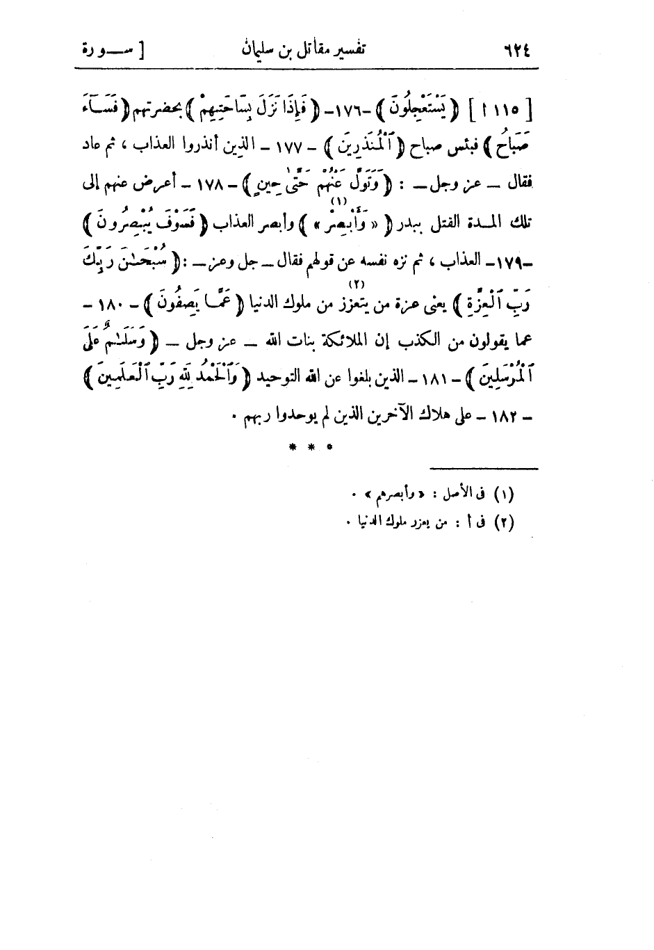 [115 ا] يَسْتَعْجِلُونَ- 176- فَإِذا نَزَلَ بِساحَتِهِمْ بحضرتهم فَساءَ صَباحُ فبئس صباح الْمُنْذَرِينَ- 177- الذين أنذروا العذاب، ثم عاد فقال- عز وجل-: وَتَوَلَّ عَنْهُمْ حَتَّى حِينٍ- 178- أعرض عنهم إلى تلك المدة القتل ببدر «وَأَبْصِرْ» «1» وأبصر العذاب فَسَوْفَ يُبْصِرُونَ- 179- العذاب، ثم نزه نفسه عن قولهم فقال- جل وعز-: سُبْحانَ رَبِّكَ رَبِّ الْعِزَّةِ يعني عزة من يتعزز «2» من ملوك الدنيا عَمَّا يَصِفُونَ- 180- عما يقولون من الكذب إن الملائكة بنات الله- عز وجل- وَسَلامٌ عَلَى الْمُرْسَلِينَ- 181- الذين بلغوا عن الله التوحيد وَالْحَمْدُ لِلَّهِ رَبِّ الْعالَمِينَ- 182- على هلاك الآخرين الذين لم يوحدوا ربهم.