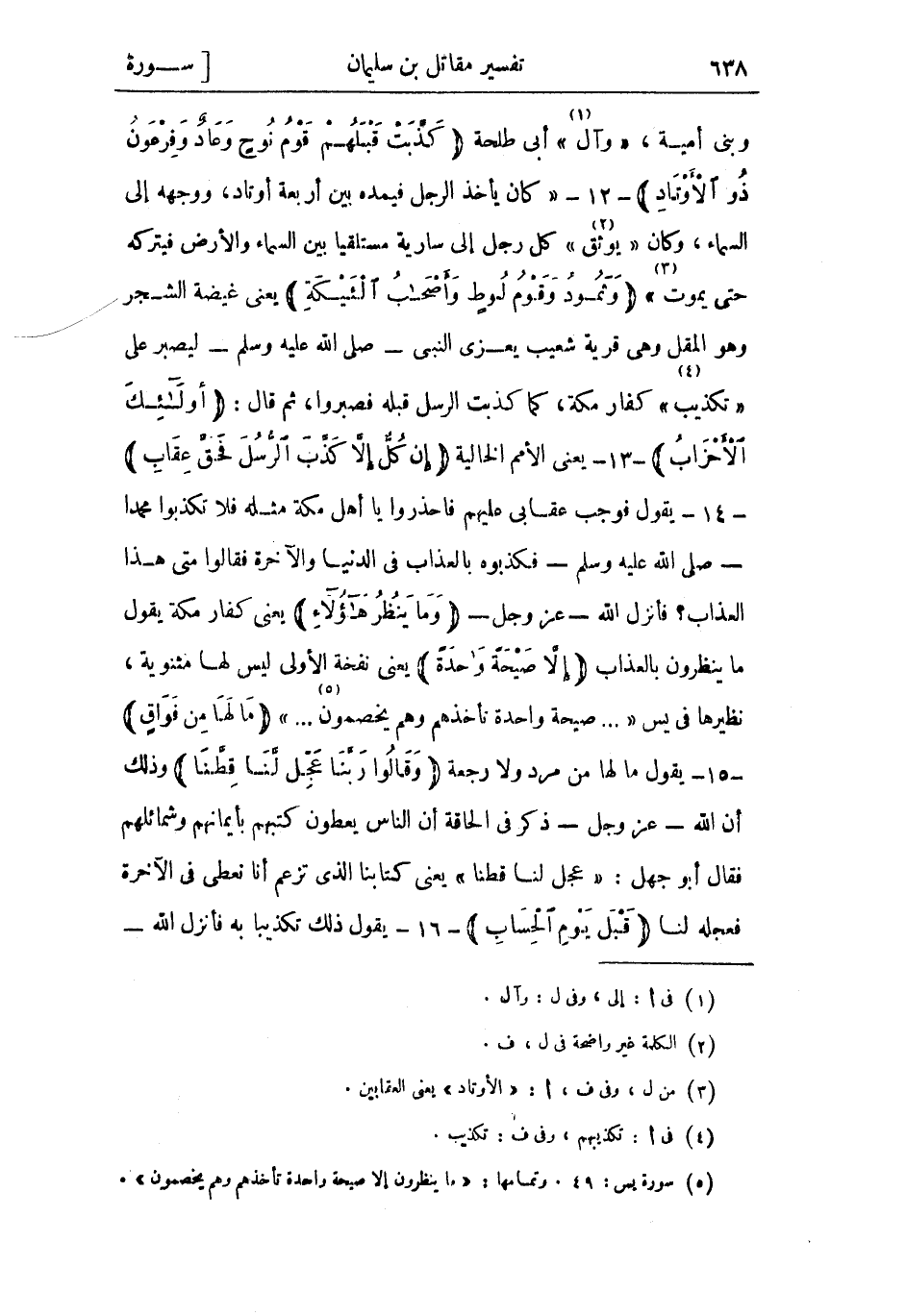 وبني أمية، «وآل «1» » أبي طلحة كَذَّبَتْ قَبْلَهُمْ قَوْمُ نُوحٍ وَعادٌ وَفِرْعَوْنُ ذُو الْأَوْتادِ- 12- «كان يأخذ الرجل فيمده بين أربعة أوتاد، ووجهه إلى السماء، وكان «يوثق» «2» كل رجل إلى سارية مستلقيا بين السماء والأرض فيتركه حتى يموت» «3» وَثَمُودُ وَقَوْمُ لُوطٍ وَأَصْحابُ الْأَيْكَةِ يعني غيضة الشجر وهو المقل وهي قرية شعيب يعزي النبي- صلى الله عليه وسلم- ليصبر على «تكذيب» «4» كفار مكة، كما كذبت الرسل قبله فصبروا، ثم قال: أُولئِكَ الْأَحْزابُ- 13- يعني الأمم الخالية إِنْ كُلٌّ إِلَّا كَذَّبَ الرُّسُلَ فَحَقَّ عِقابِ- 14- يقول فوجب عقابي عليهم فاحذروا يا أهل مكة مثله فلا تكذبوا محمدا- صلى الله عليه وسلم- فكذبوه بالعذاب في الدنيا والآخرة فقالوا متى هذا العذاب؟ فأنزل الله- عز وجل- وَما يَنْظُرُ هؤُلاءِ يعني كفار مكة يقول ما ينظرون بالعذاب إِلَّا صَيْحَةً واحِدَةً يعنى نفخة الأولى ليس لها مثنوية، نظيرها في يس « ... صَيْحَةً واحِدَةً تَأْخُذُهُمْ وَهُمْ يَخِصِّمُونَ «5» ... » ما لَها مِنْ فَواقٍ- 15- يقول ما لها من مرد ولا رجعة وَقالُوا رَبَّنا عَجِّلْ لَنا قِطَّنا وذلك أن الله- عز وجل- ذكر في الحاقة أن الناس يعطون كتبهم بأيمانهم وشمائلهم فقال أبو جهل: «عَجِّلْ لَنا قِطَّنا» يعني كتابنا الذي تزعم أنا نعطى في الآخرة فعجله لنا قَبْلَ يَوْمِ الْحِسابِ- 16- يقول ذلك تكذيبا به فأنزل الله-