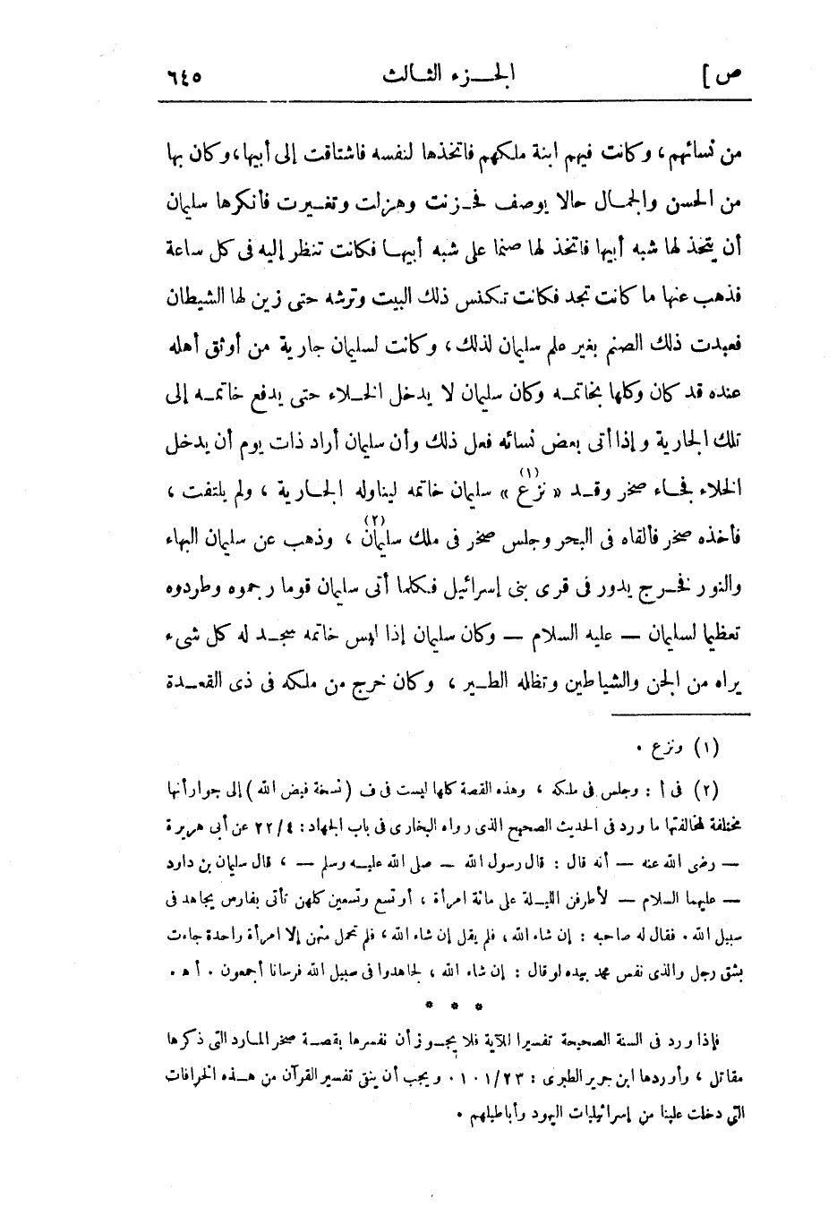 من نسائهم، وكانت فيهم ابنة ملكهم فاتخذها لنفسه فاشتاقت إلى أبيها، وكان بها من الحسن والجمال حالا يوصف فحزنت وهزلت وتغيرت فأنكرها سليمان أن يتخذ لها شبه أبيها فاتخذ لها صنما على شبه أبيها فكانت تنظر إليه في كل ساعة فذهب عنها ما كانت تجد فكانت تكنس ذلك البيت وترشه حتى زين لها الشيطان فعبدت ذلك الصنم بغير علم سليمان لذلك، وكانت لسليمان جارية من أوثق أهله عنده قد كان وكلها بخاتمه وكان سليمان لا يدخل الخلاء حتى يدفع خاتمه إلى تلك الجارية وإذا أتى بعض نسائه فعل ذلك وأن سليمان أراد ذات يوم أن يدخل الخلاء فجاء صخر وقد «نزع» «1» سليمان خاتمه ليناوله الجارية، ولم يلتفت، فأخذه صخر فألقاه في البحر وجلس صخر في ملك سليمان «2» ، وذهب عن سليمان البهاء والنور فحرج يدور في قرى بني إسرائيل فكلما أتى سليمان قوما رجموه وطردوه تعظيما لسليمان- عليه السلام- وكان سليمان إذا لبس خاتمه سجد له كل شيء يراه من الجن والشياطين وتظله الطير، وكان خرج من ملكه فى ذى القعدة