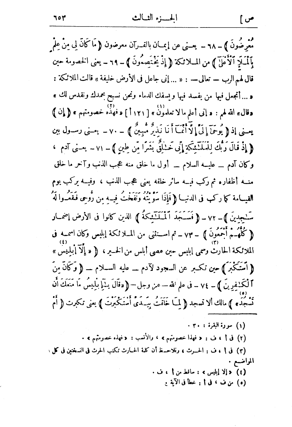 « ... أَتَجْعَلُ فِيها مَنْ يُفْسِدُ فِيها وَيَسْفِكُ الدِّماءَ وَنَحْنُ نُسَبِّحُ بِحَمْدِكَ وَنُقَدِّسُ لَكَ» «قَالَ» الله لهم: «إِنِّي أَعْلَمُ مَا لا تَعْلَمُونَ» «1» [121 أ] «فهذه «2» خصومتهم» إِنْ يعني إذ يُوحى إِلَيَّ إِلَّا أَنَّما أَنَا نَذِيرٌ مُبِينٌ
