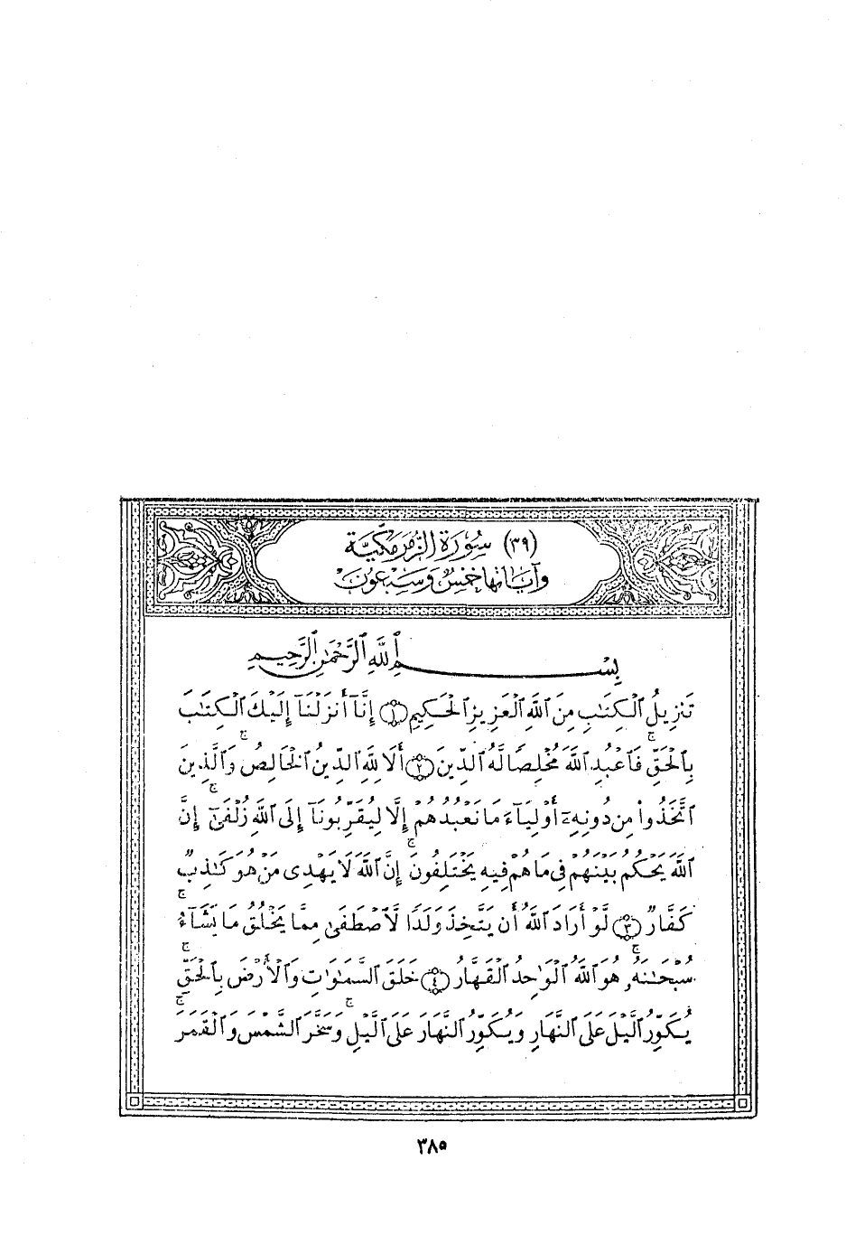 تَنْزِيلُ الْكِتابِ مِنَ اللَّهِ الْعَزِيزِ الْحَكِيمِ (1) إِنَّا أَنْزَلْنا إِلَيْكَ الْكِتابَ بِالْحَقِّ فَاعْبُدِ اللَّهَ مُخْلِصاً لَهُ الدِّينَ (2) أَلا لِلَّهِ الدِّينُ الْخالِصُ وَالَّذِينَ اتَّخَذُوا مِنْ دُونِهِ أَوْلِياءَ مَا نَعْبُدُهُمْ إِلاَّ لِيُقَرِّبُونا إِلَى اللَّهِ زُلْفى إِنَّ اللَّهَ يَحْكُمُ بَيْنَهُمْ فِي مَا هُمْ فِيهِ يَخْتَلِفُونَ إِنَّ اللَّهَ لا يَهْدِي مَنْ هُوَ كاذِبٌ كَفَّارٌ (3) لَوْ أَرادَ اللَّهُ أَنْ يَتَّخِذَ وَلَداً لاصْطَفى مِمَّا يَخْلُقُ مَا يَشاءُ سُبْحانَهُ هُوَ اللَّهُ الْواحِدُ الْقَهَّارُ (4)