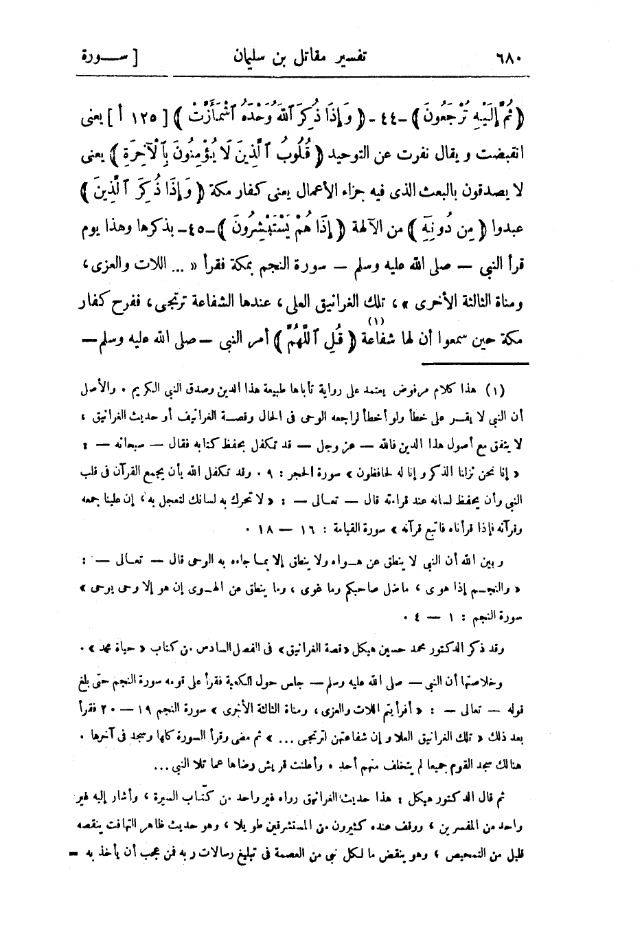 ثم قال الدكتور هيكل: هذا حديث الغرانيق رواه غير واحد من كتاب السيرة، وأشار إليه غير واحد من المفسرين، ووقف عنده كثيرون من المستشرقين طويلا، وهو حديث ظاهر التهافت ينقصه قليل من التمحيص، وهو ينقض ما لكل نبى من العصمة فى تبليغ رسالات ربه فمن عجب أن يأخذ به [.....]